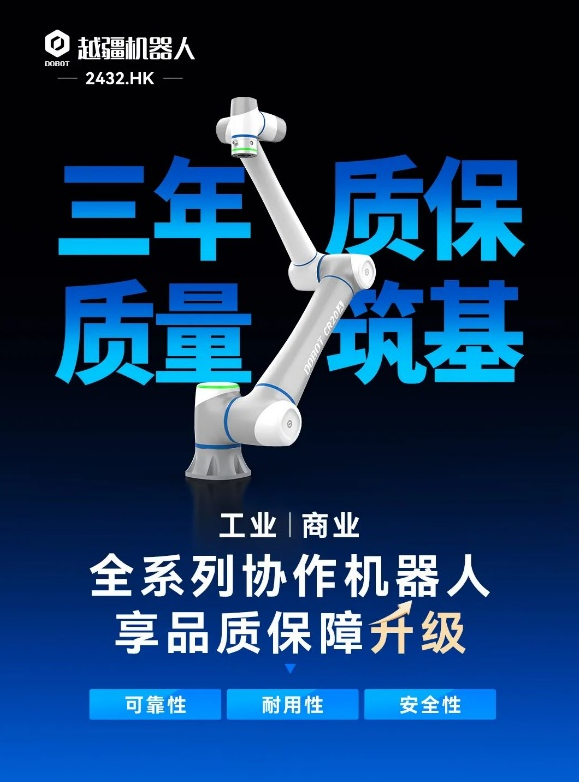 越疆机器人率先树立行业品质责任新标杆!面向工业、商业领域应用全系列协作机器人产品质保升级至三年。这是越疆机器人对于自身产品质量的确信,对于生产制造稳定性和一致性的确信。