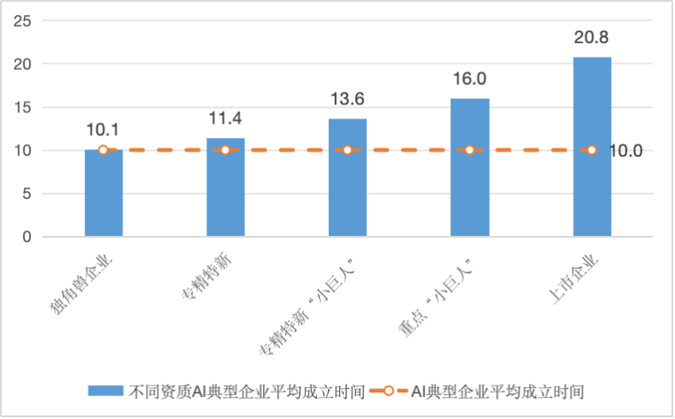 进一步细分来看,独角兽AI典型企业平均成立时间10.1年,专精特新AI典型企业平均成立时间11.4年,专精特新“小巨人”AI典型企业平均成立时间13.6年,重点“小巨人”AI典型企业平均成立时间16.0年,AI相关上市企业平均成立时间20.8年。这一数据序列呈现出随着企业资质等级提升,平均成立时间递增的趋势。