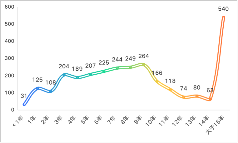 据深圳市人工智能产业协会研究部统计,截至2024年12月,深圳共有2887家人工智能典型企业,其平均成立时间为10年。其中,成立时间少于10年的企业有1846家,占比63.9%;成立时间超过10年的企业有1041家,占比36.1%。从第9年开始至今,被纳入典型AI企业的数量整体呈下降趋势。