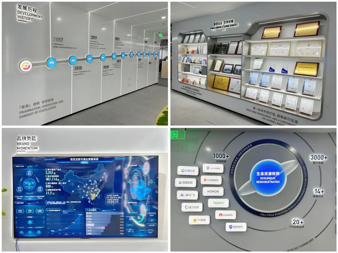 会议正式开始前,在优优互联公共事务总监陈丽杜的引导下,杨会长一行首先参观了企业展厅。展厅内,从企业品牌势能的生动呈现,到品牌文化的深度解读,再到清晰梳理的发展历程时间轴,全方位展现了优优互联在网络科技领域的深耕与积淀。墙上错落有致的荣誉墙,更是企业技术实力与行业认可度的直观体现,每一项荣誉背后,都是优优互联持续创新、追求卓越的见证。此外,展厅中展示的生态资源矩阵,也让我们对优优互联的业务布局、资源整合能力及未来发展潜力有了更全面的认识。
