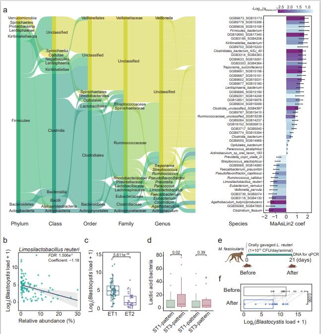 图5. 乳酸菌对恒河猴芽囊原虫负荷的影响。(a) MaAsLin2分析中物种水平微生物分类单元与芽囊原虫负荷的关联。展示了按q值排名(q < 0.1)的主要分类单元,分别显示不同水平。(b) MaAsLin2分析中Limosilactobacillus reuteri相对丰度与芽囊原虫负荷的相关性。(c) 不同肠型(ET1和ET2)样本之间芽囊原虫负荷的比较。(d) 对于芽囊原虫负荷可比的样本,ST1模式与ST3模式中乳酸菌(Lactobacillus和Limosilactobacillus)的相对丰度。(e) 恒河猴独立队列的实验设计。每天口服给予L.reuteri。(f) 实验前后芽囊原虫负荷的变化。使用qPCR检测粪便中芽囊原虫的丰度。a、b和c面板的分析已使用MaAsLin2调整混杂变量(性别、年龄和BMI)。P值或FDR计算方法如下:图a、b和c:MaAsLin2;图d:Wilcoxon秩和检验;图f:Wilcoxon配对秩和检验。箱线图表示第25百分位数、中位数和第75百分位数,须状线延伸至对应四分位间距的1.5倍。图a和f显示数据为均值 ± 标准差(mean ± SD)。