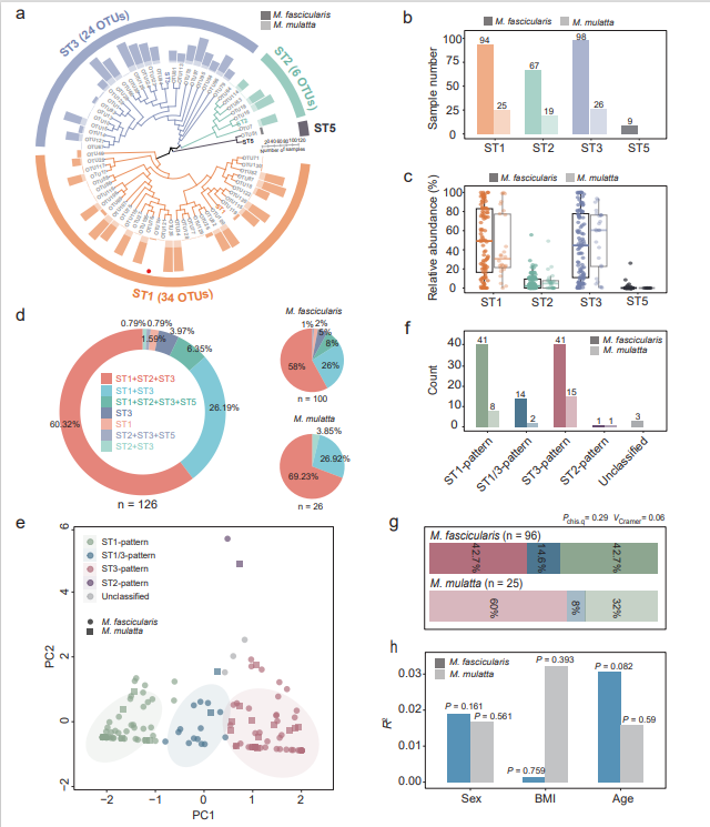 图2. 非人灵长类动物体内芽囊原虫共现模式的特征。(a) OTU水平芽囊原虫亚型多样性的系统发育树。带高亮颜色的OTU表示每个亚型的参考序列。柱状图显示扩增子测序中每个亚型在样本中出现的数量。(b) 每个芽囊原虫亚型的分布情况。(c) 每个亚型在样本中的相对丰度。(d) 非人灵长类动物体内芽囊原虫亚型共现(共存模式)的多样性。(e) 共现模式的分布。共现模式使用基于模糊K均值的方法进行聚类。(f) 每种模式下的样本数量。(g) 三种主要模式(ST1模式、ST1/3模式和ST3模式)的流行率。(h) 每个宿主变量(性别、BMI和年龄)对共现模式PCA的效应大小和显著性(置换多元方差分析)。R²值表示每个变量的效应大小。P值在图g中通过卡方检验获得,在图h中通过置换多元方差分析获得。箱线图表示第25百分位数、中位数和第75百分位数,须状线延伸至对应四分位间距的1.5倍。