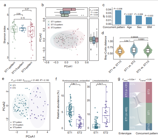 图4. 恒河猴中不同共现模式下的肠道菌群特征。(a) 不同共现模式下的Shannon多样性指数。(b) 基于Bray-Curtis距离的物种水平肠道菌群主坐标分析(PCoA)。(c) 共现模式及样本协变量对PCoA分析的效应大小。每个变量的R²值通过置换多元方差分析计算得出。(d) 不同组间的Bray-Curtis距离比较。(e) 共现模式下的肠道菌群肠型。肠型通过Jensen-Shannon距离和基于中值点的聚类在属水平进行鉴定。(f) 肠型内Ruminococcaceae和Limosilactobacillus的相对丰度。(g) 肠型(ET1和ET2)与共现模式之间的关联。每个面板显示样本数量。b和e面板的分析中已调整混杂变量(性别、年龄和BMI)。P值计算方法如下:图a、d和f使用Wilcoxon秩和检验;图b、c和e使用置换多元方差检验;图g使用卡方检验。箱线图表示第25百分位数、中位数和第75百分位数,须状线延伸至对应四分位间距的1.5倍。
