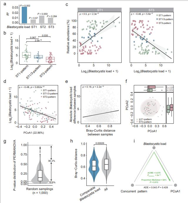 图3. 芽囊原虫负荷解释了恒河猴中共现模式与肠道菌群的关联。(a) 芽囊原虫绝对丰度及各亚型相对丰度与共现模式相关,对肠道菌群PCoA分析(图3b)的效应大小(置换多元方差分析)。(b) 各共现模式下芽囊原虫的绝对丰度。Y轴为Log2转换值。(c) 样本中ST1(或ST3)相对丰度与芽囊原虫总负荷的Spearman相关性。(d) 芽囊原虫负荷与PCoA分析中第一主坐标(PCoA1,图3b)的Spearman相关性。(e) Bray-Curtis距离与芽囊原虫负荷的Spearman相关性。(f) 对ST1模式和ST3模式样本进行Bray-Curtis距离的PCoA分析,确保两组样本的芽囊原虫负荷可比较。(g) 通过自助抽样(n = 1,000)进行置换多元方差分析的P值分布。(h) 在绝对丰度可比的样本中,ST1模式与ST3模式之间的Bray-Curtis距离。(i) 中介效应分析显示ST1和ST3模式下共现模式、肠道菌群PCoA1与Blastocystis负荷之间的关系。d和f面板的分析已调整混杂变量(性别、年龄和BMI)。P值计算方法如下:图a和f:置换多元方差检验;图b和h:Wilcoxon秩和检验;图d:MaAsLin2分析;图i:中介效应分析;图c和e:Spearman秩相关系数检验。箱线图表示第25百分位数、中位数和第75百分位数,须状线延伸至对应四分位间距的1.5倍。