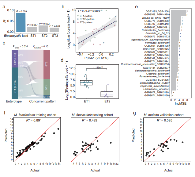 图6. 肠道菌群组成可预测非人灵长类动物中芽囊原虫负荷。(a)恒河猴肠道菌群PCoA分析中每个变量的效应大小。每个变量的效应大小和显著性通过置换多元方差分析确定。(b)恒河猴样本中芽囊原虫负荷与微生物分析PCoA第一主坐标(PCoA1)的Spearman相关性。(c) 恒河猴中肠型(ET1和ET2)与共现模式(ST1/3、ST1和ST3)之间的关联。(d)恒河猴样本中ET1和ET2肠型的芽囊原虫负荷。(e) 随机森林(RF)分析在发现队列数据集(n = 71)中鉴定出的标记(n = 28)。这些标记按平均平方误差增加百分比排序。(f) RF模型在预测食蟹猴训练集或测试集中的表现。(g) RF模型在预测独立验证队列恒河猴中的表现。图b和d的分析已使用MaAsLin2调整混杂变量(性别、年龄和BMI)。P值计算方法如下:图a面板:置换多元方差分析;图b和d:MaAsLin2分析;图c:卡方检验。*P值 < 0.05;**P值 < 0.01。