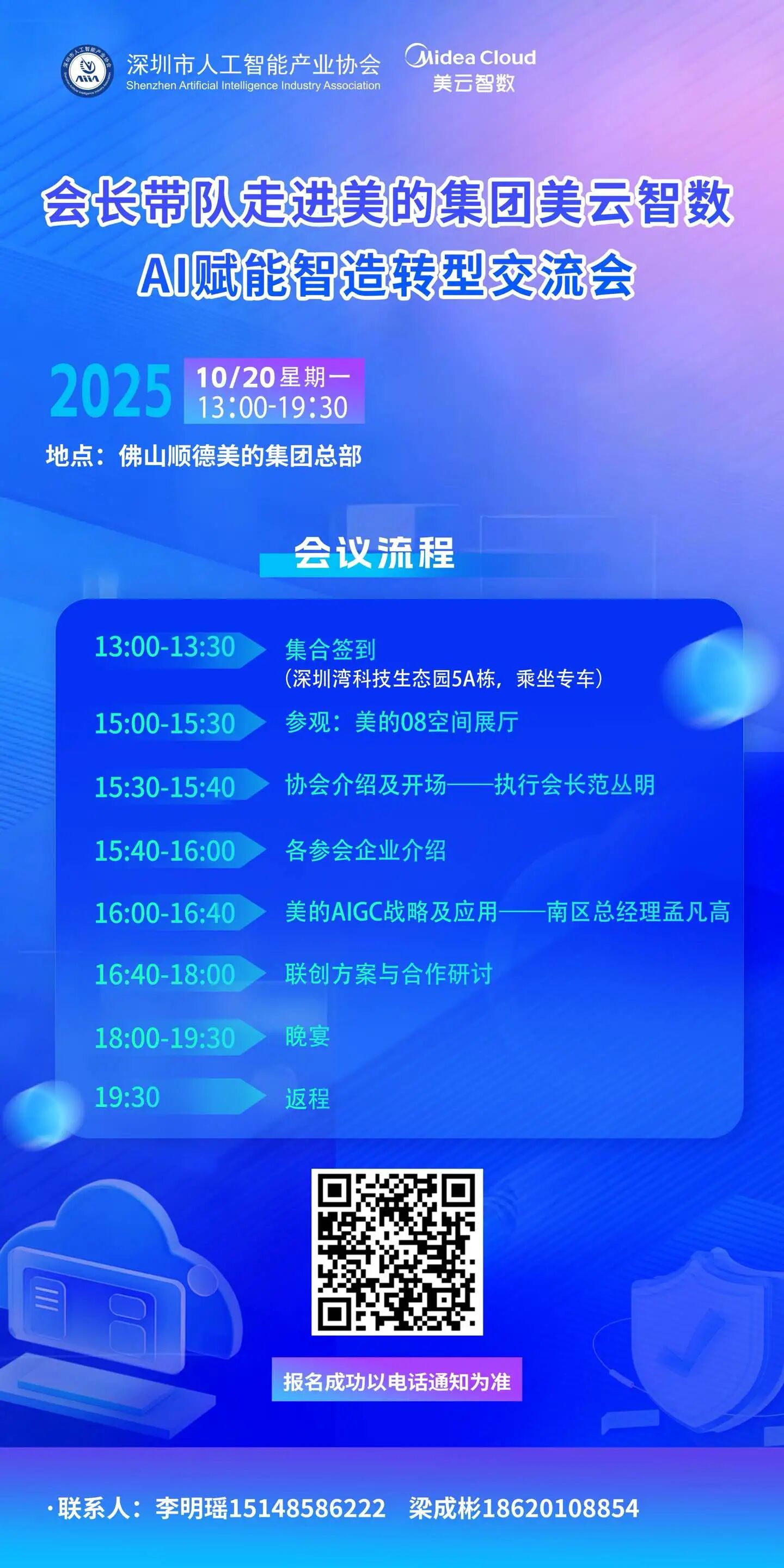 智启新程,共探智造未来!深圳市人工智能产业协会诚邀您参与10月20日(周一)13:00-19:30在美的集团总部举办的「AI赋能智造转型交流会」。范会长将亲自带队走进美的集团美云智数,解锁智能制造新图景。