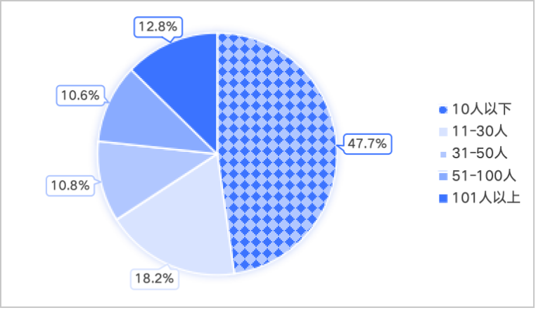 根据深圳市人工智能产业协会研究部对协会会员抽样调查。在企业研发人员数量方面,调研数据显示,47.7%的企业研发人员数量在10人以下,18.2%的企业研发人员数量在11-30人之间,10.8%的企业研发人员数量在31-50人,10.6%的企业研发人员数量在51-100人,12.8%的企业研发人员数量超过101人。