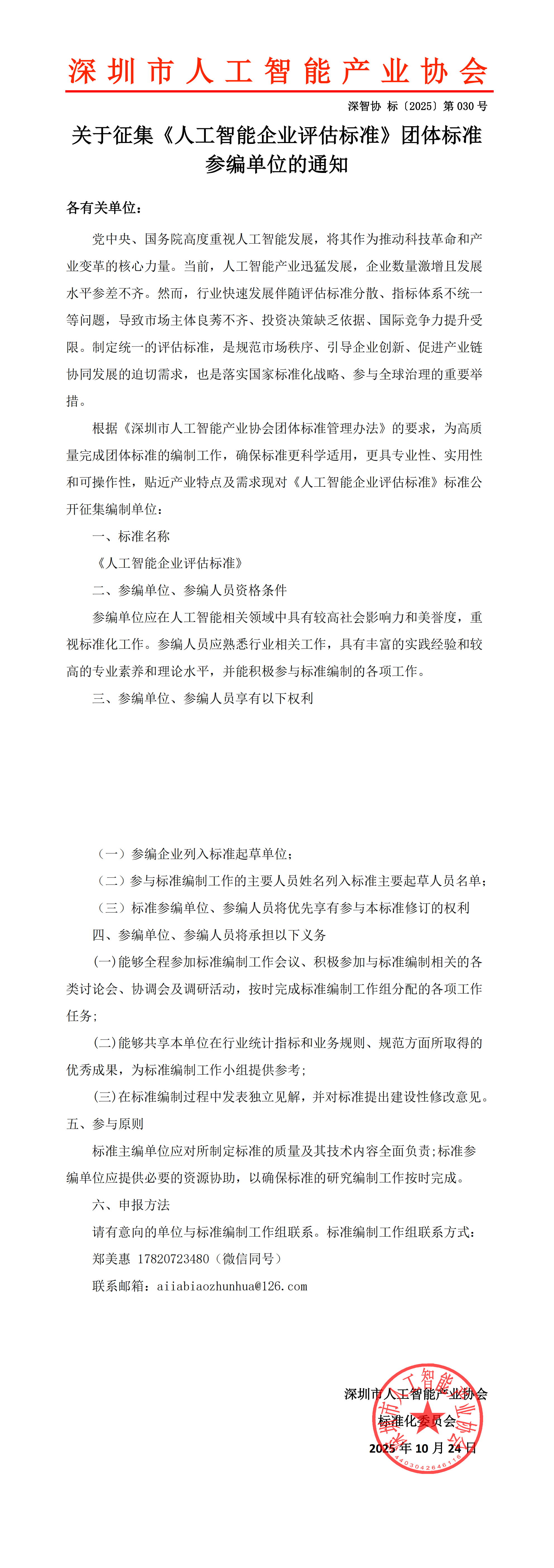 【参编征集】关于征集《人工智能企业评估标准》团体标准参编单位的通知