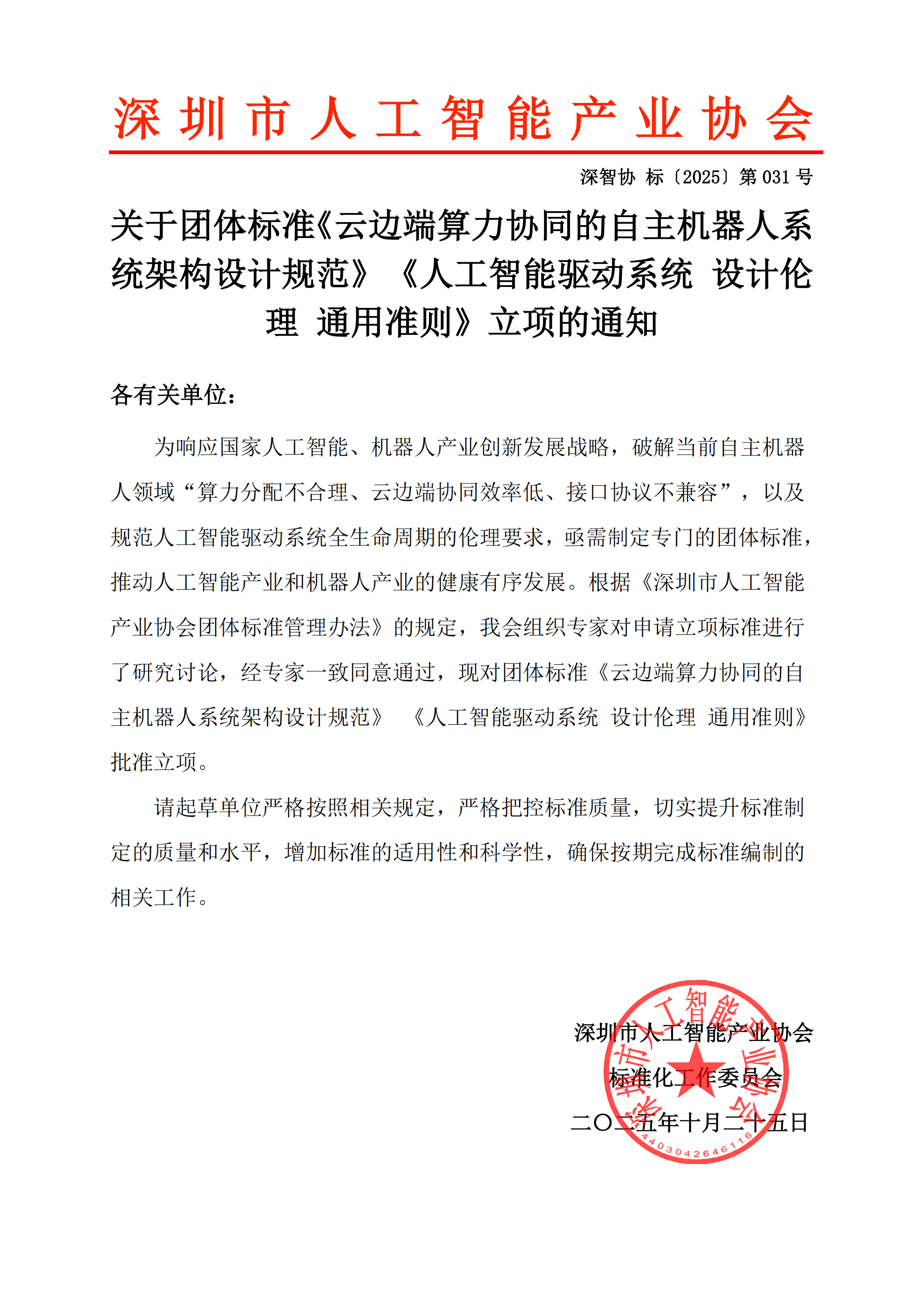 为响应国家人工智能、机器人产业创新发展战略,破解当前自主机器人领域“算力分配不合理、云边端协同效率低、接口协议不兼容”,以及规范人工智能驱动系统全生命周期的伦理要求,亟需制定专门的团体标准,推动人工智能产业和机器人产业的健康有序发展。根据《深圳市人工智能产业协会团体标准管理办法》的规定,我会组织专家对申请立项标准进行了研究讨论,经专家一致同意通过,现对团体标准《云边端算力协同的自主机器人系统架构设计规范》 《人工智能驱动系统 设计伦理 通用准则》批准立项。