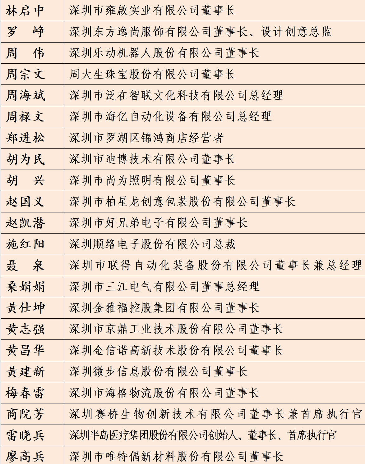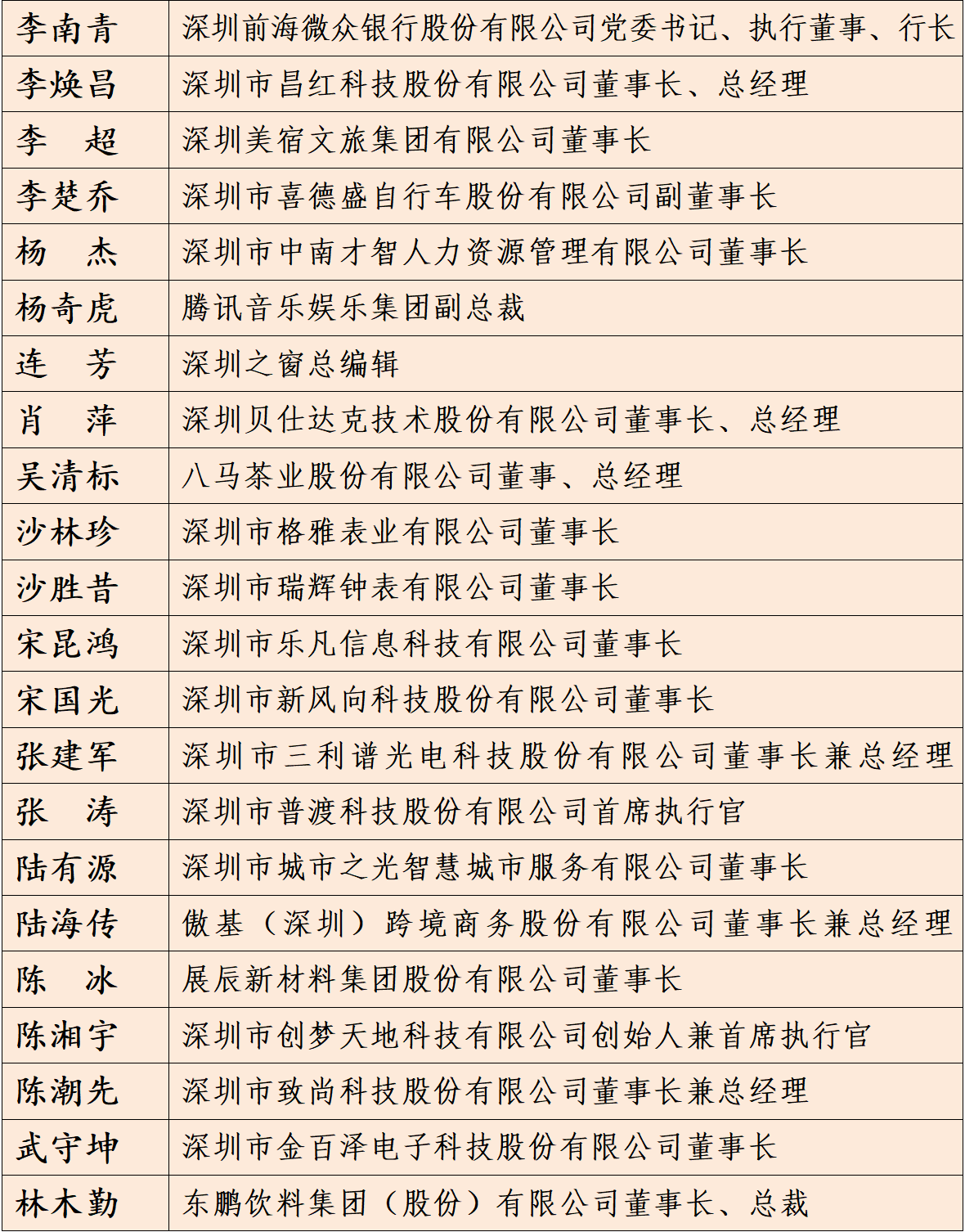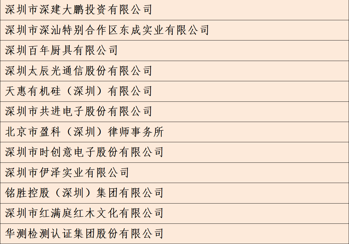 深圳市非公有制经济人士优秀中国特色社会主义事业建设者及深圳市光彩事业贡献奖具体名单如下: