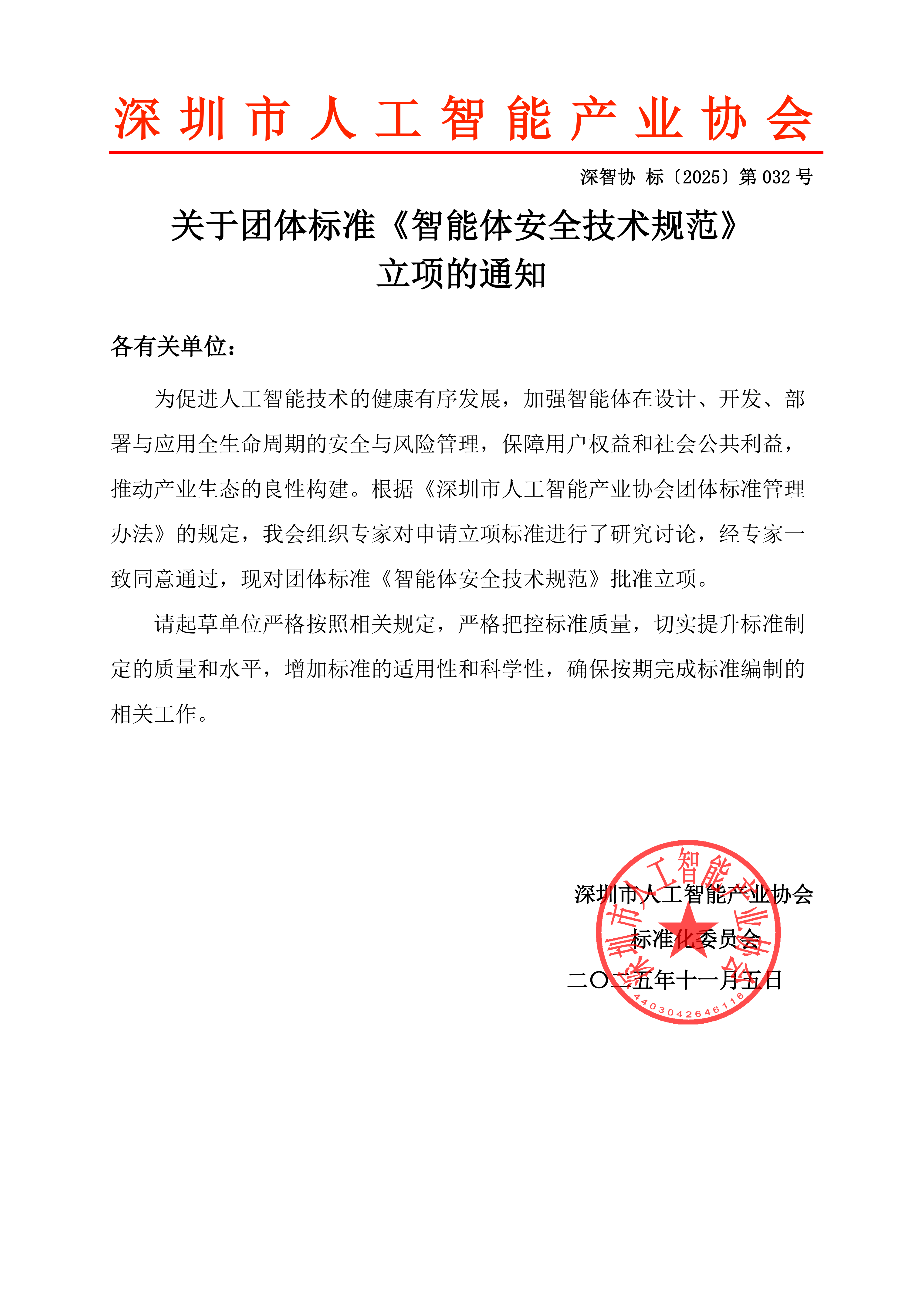 为促进人工智能技术的健康有序发展,加强智能体在设计、开发、部署与应用全生命周期的安全与风险管理,保障用户权益和社会公共利益推动产业生态的良性构建。根据《深圳市人工智能产业协会团体标准管理办法》的规定,我会组织专家对申请立项标准进行了研究讨论,经专家一致同意通过,现对团体标准《智能体安全技术规范》批准立项。