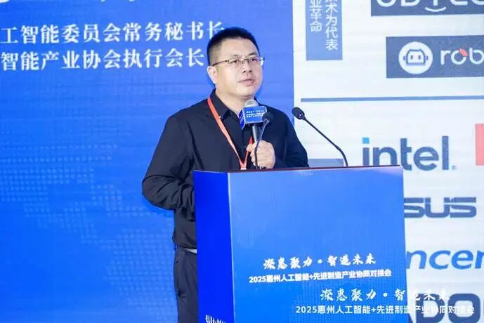 随后,全国工商联人工智能委员会常务秘书长、深圳市人工智能产业协会执行会长范丛明致辞并作《深惠协同:智创未来新机遇》主题演讲。范会长表示,本次活动紧密围绕省委“协同打造产业带”的战略部署。并强调本次对接会不仅是一次资源的汇聚,更是一次面向具体场景的精准对接。探讨深圳企业如何将AI算法、智能控制技术、机器人解决方案等,与惠州雄厚的生产线相结合,例如在超高清显示面板的精准检测、新能源电池产线的全生命周期运维、智能终端工厂的柔性制造等领域实现突破,让前沿技术真正在产线上“生根发芽”,共同打造“深圳创新+惠州制造”的协同典范。