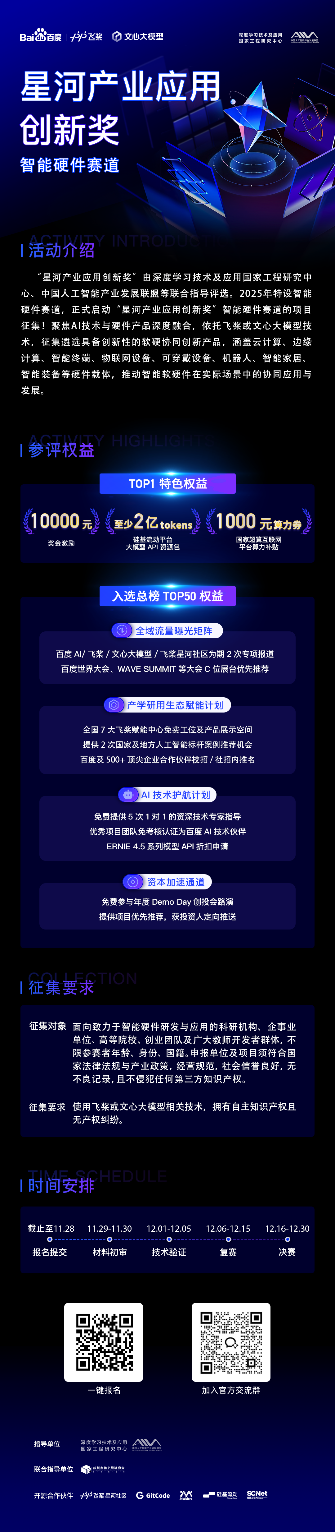 “星河产业应用创新奖”由深度学习技术及应用国家工程研究中心、中国人工智能产业发展联盟等联合指导评选。2025年特设智能硬件赛道,正式启动“星河产业应用创新奖”智能硬件赛道的项目征集!聚焦AI技术与硬件产品深度融合,依托飞桨或文心大模型技术,征集遴选具备创新性的软硬协同创新产品,涵盖云计算、边缘计算、智能终端、物联网设备、可穿戴设备、机器人、智能家居、智能装备等硬件载体,推动智能软硬件在实际场景中的协同应用与发展。