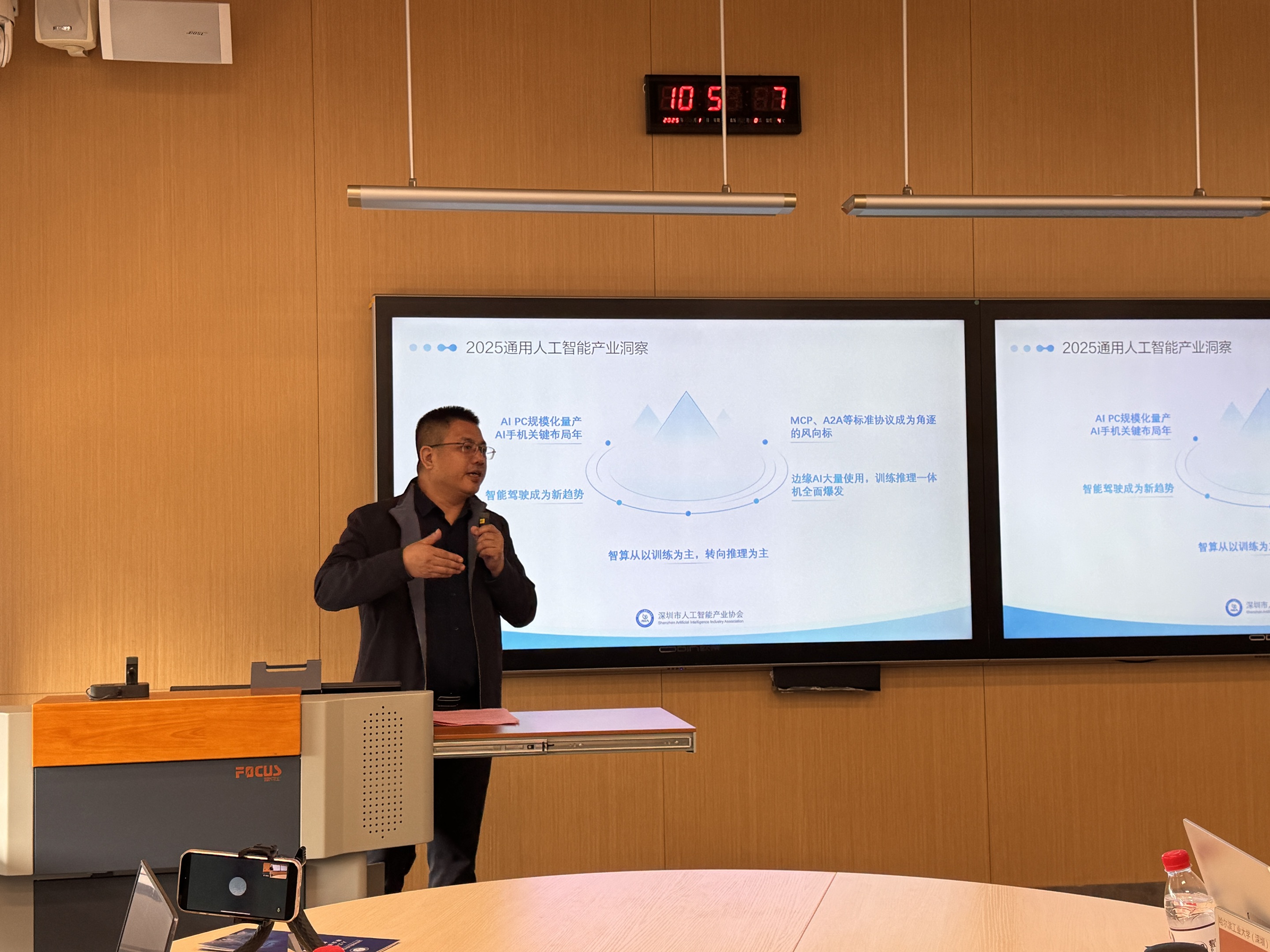 深圳市人工智能产业协会执行会长范丛明致辞并发表主题演讲,范会长指出,人工智能已历经四次发展浪潮,从早期知识与逻辑推理的技术探索,到深度学习的规模化渗透,当前大模型与智能体技术正推动产业完成从“AI产业化”到“产业AI化”的关键跃迁。并强调,AI将在科技突破、产业增效、民生提升、消费升级、治理优化、全球共赢六大领域持续发力,其中“人机协同”是深圳AI产业差异化发展的关键赛道。希望企业代表与产业伙伴以此次活动为契机,深度挖掘深圳AI产业的技术积淀与场景优势,拓展人机协同领域的价值共创空间,最终实现人工智能技术创新与人力资源效能提升的双向共赢,为深圳建设全球领先的人工智能创新策源地注入新动能。