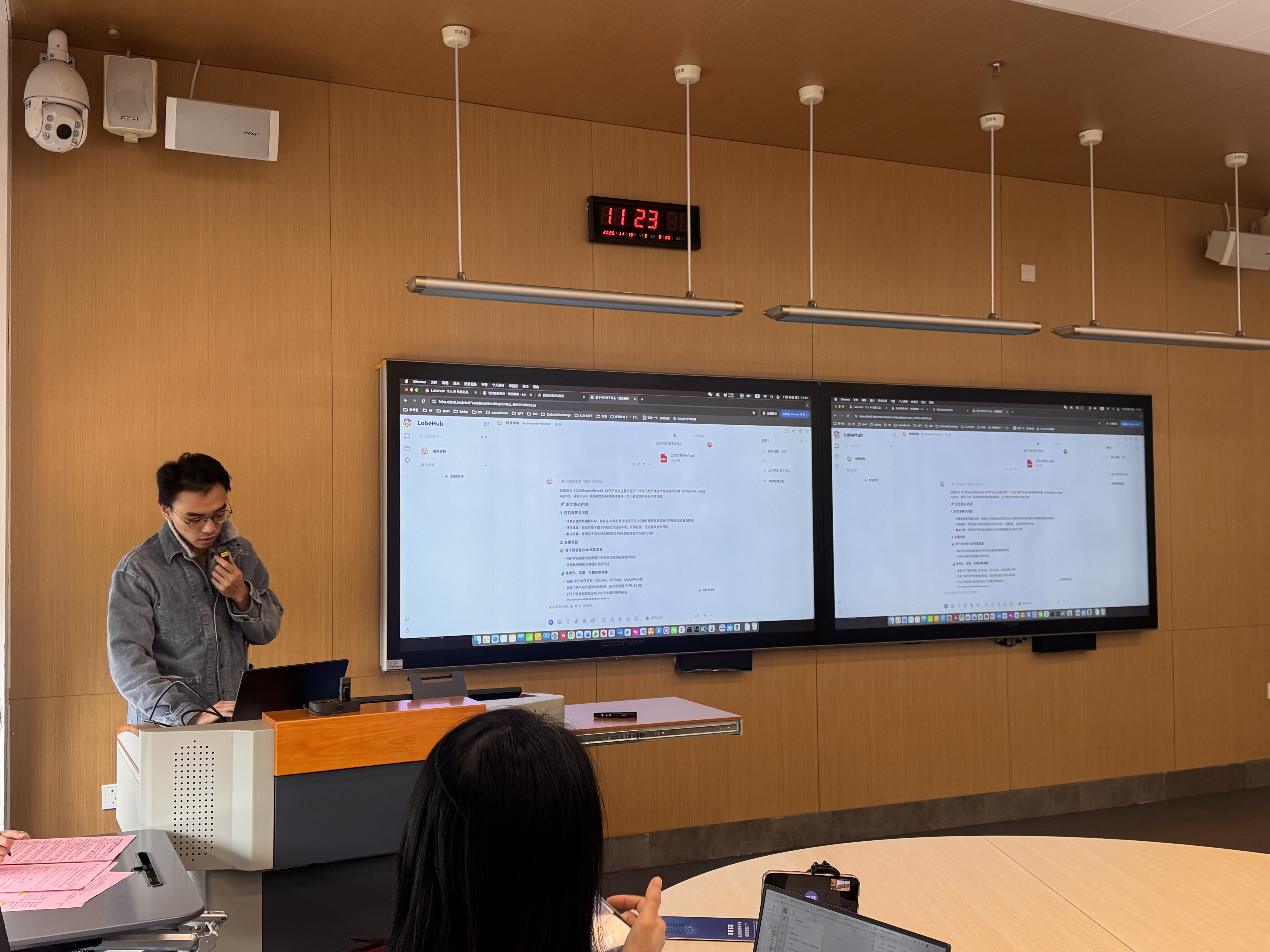 哈工大(深圳)博士生马腾云现场演示了实验配套AI平台的核心功能,展现其在任务处理、数据分析与人机交互方面的技术优势,说明该平台如何有效提升企业员工的工作效率与决策质量,为实验的数据采集与效果验证提供平台基础。