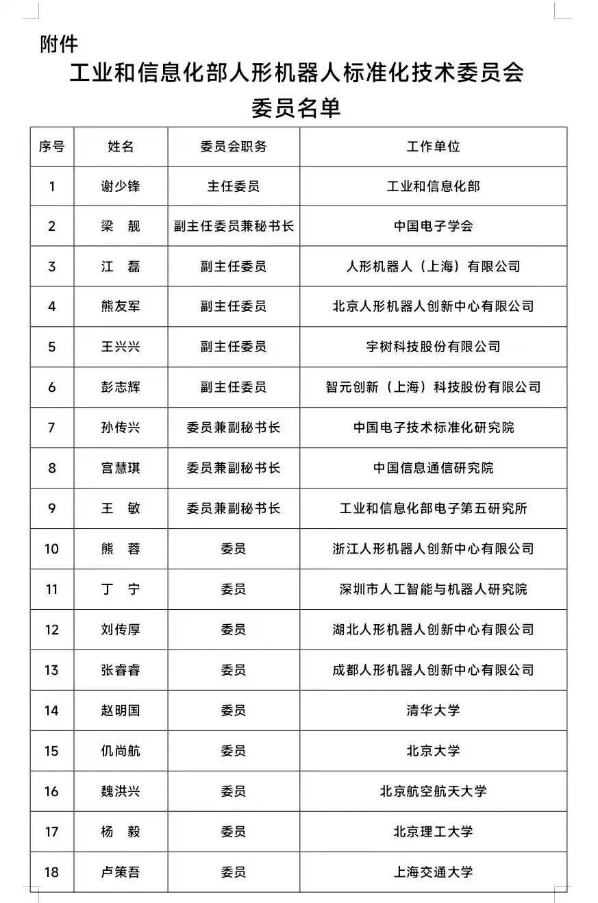 名单显示,北京人形机器人创新中心有限公司CEO熊友军、宇树科技股份有限公司创始人、CEO王兴兴和智元创新(上海)科技股份有限公司联合创始人、总裁、CTO彭志辉担任工业和信息化部人形机器人标准化技术委员会副主任委员。