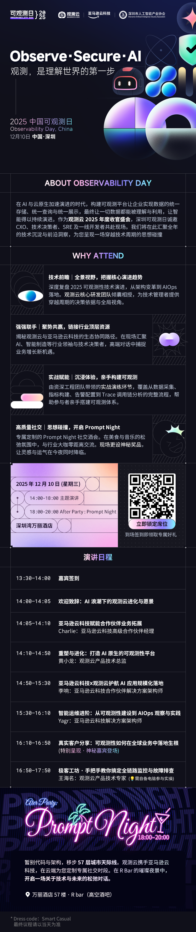 作为2025中国可观测日的年度收官盛会,我们把一整年的技术沉淀与前沿洞察,浓缩在这一下午。