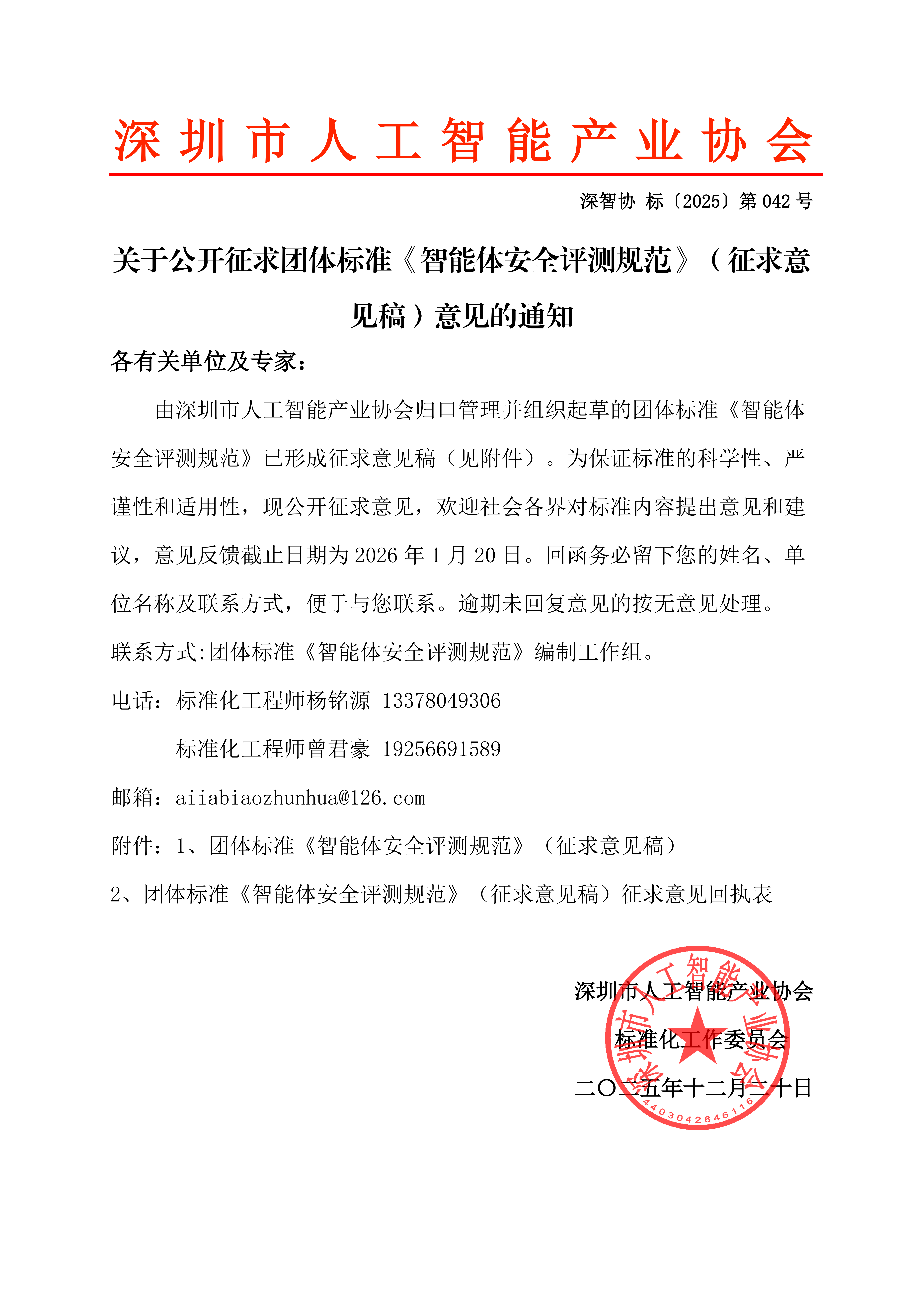 由深圳市人工智能产业协会归口管理并组织起草的团体标准《智能体安全评测规范》已形成征求意见稿(见附件)。为保证标准的科学性、严谨性和适用性,现公开征求意见,欢迎社会各界对标准内容提出意见和建议,意见反馈截止日期为2026年1月20日。回函务必留下您的姓名、单位名称及联系方式,便于与您联系。逾期未回复意见的按无意见处理。