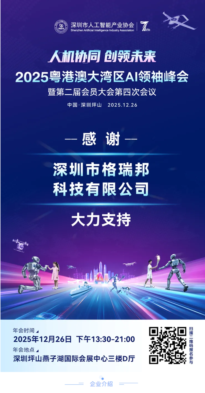 2025粤港澳大湾区AI领袖峰会暨第二届会员大会第四次会议汇聚1300+大湾区品牌名企、AI领域权威院士及专家,搭建起行业交流、资源对接、思想碰撞的顶级平台。此次深圳市格瑞邦科技有限公司的加入,将凭借其深耕智能硬件与医疗防护领域15年的积淀,将为大会注入面向教育场景的智能平板等创新产品解决方案,与医疗防护领域的技术积累形成跨界融合优势,为参会者探索 “AI+智能硬件+医疗防护” 的产业协同发展新路径提供切实参考。12月26日,让我们与深圳市格瑞邦科技有限公司及全体参会伙伴一道,聚焦智能创新与防护升级新赛道,共筑行业高质量发展新蓝图!