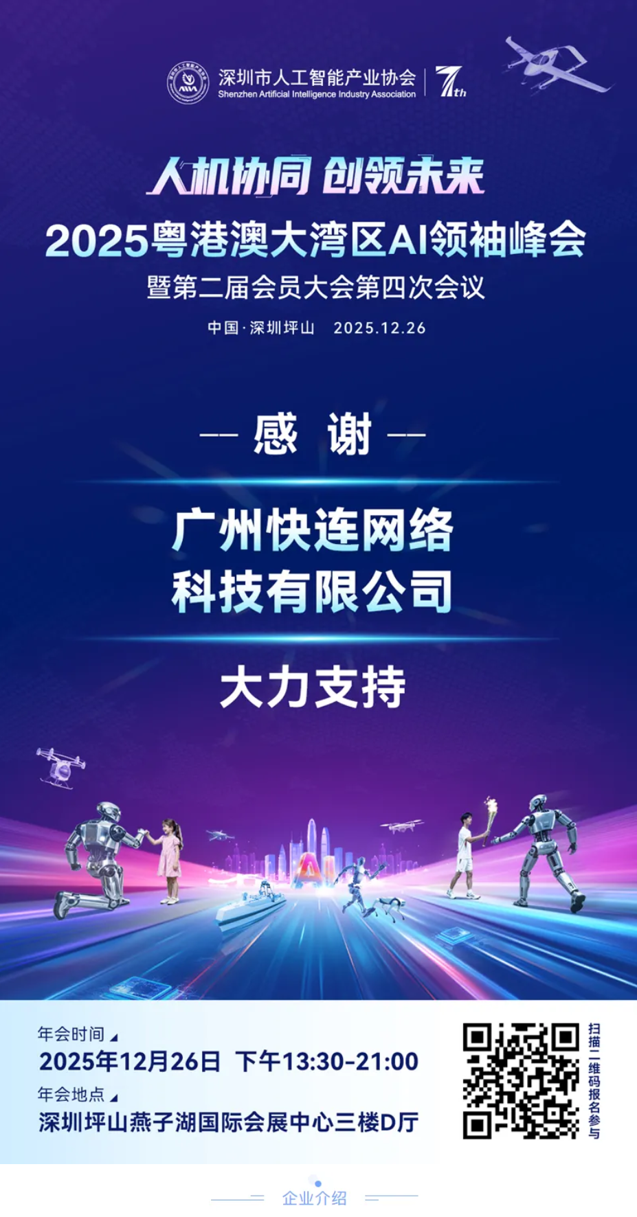 2025粤港澳大湾区AI领袖峰会暨第二届会员大会第四次会议汇聚1300+大湾区品牌名企、AI领域权威院士及专家,搭建起行业交流、资源对接、思想碰撞的顶级平台。此次广州快连网络科技有限公司的加入,将为大会注入更多数字化协作与全场景会议服务的实践经验,助力参会者探索智能时代高效会议落地新路径。12月26日,让我们与广州快连网络科技有限公司及全体参会伙伴一道,聚焦软硬融合新赛道,共绘智能办公创新新蓝图!