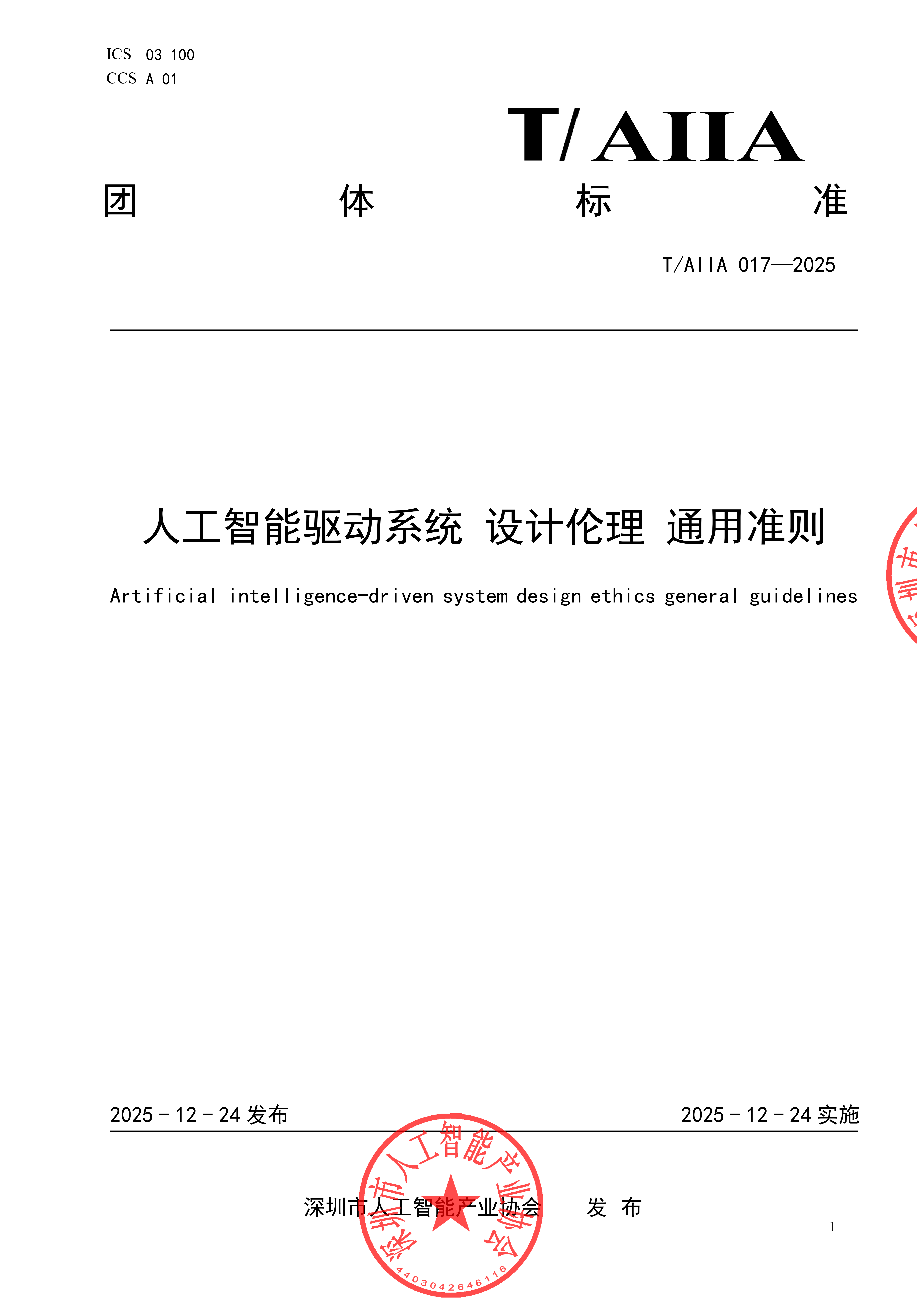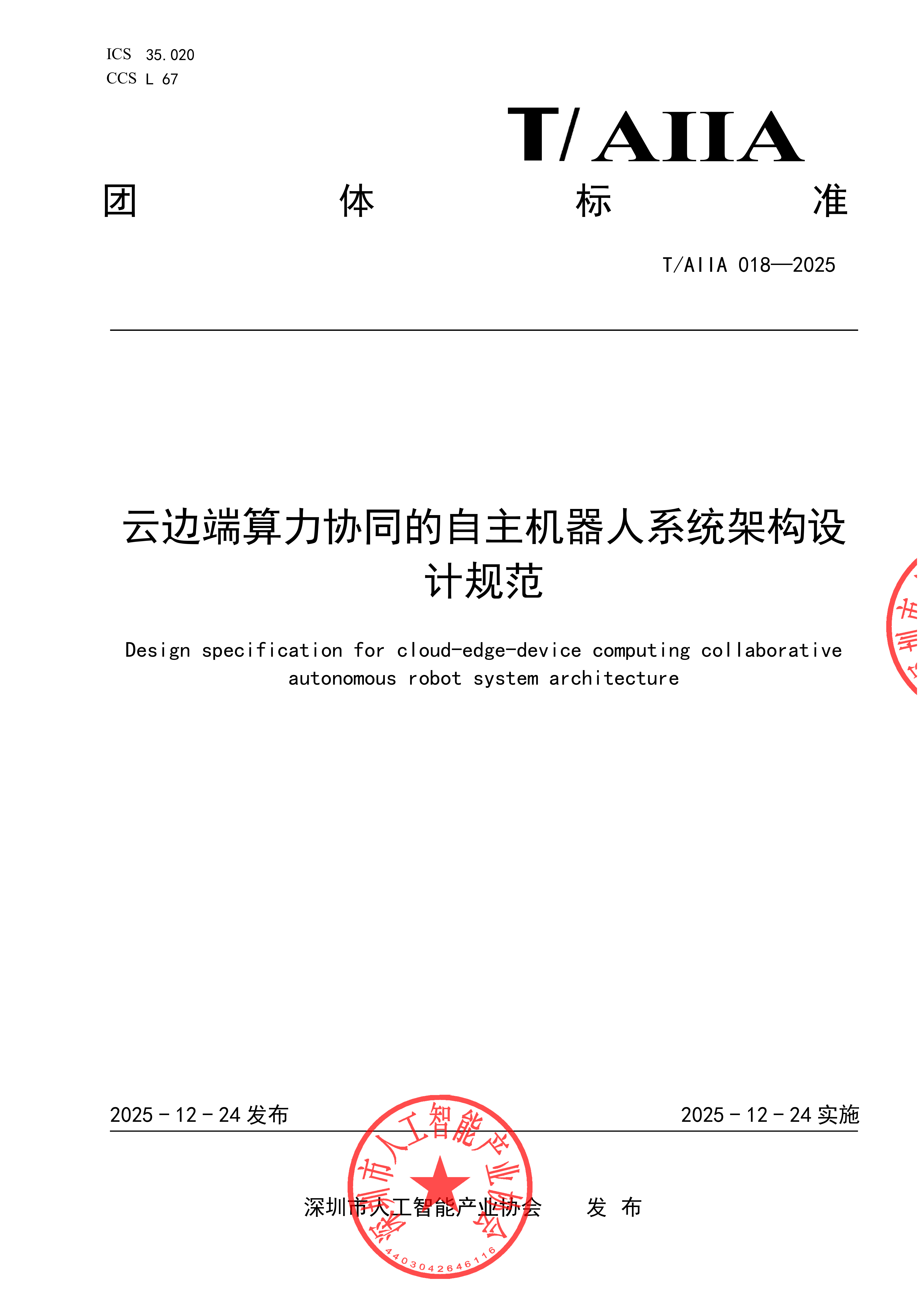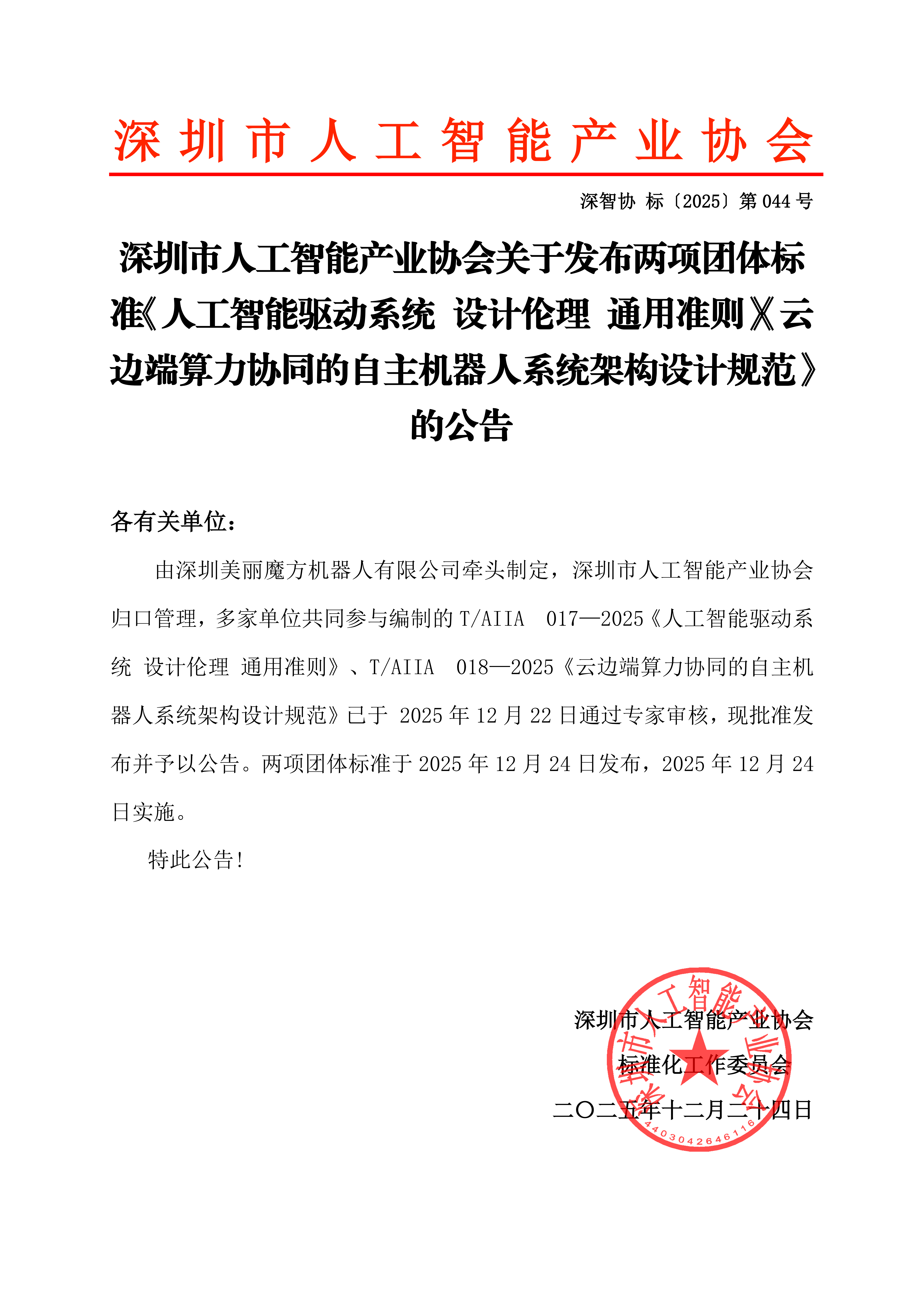 2025年12月24日深圳市人工智能产业协会正式对外发布了两项团体标准,分别为T/AIIA 017—2025《人工智能驱动系统 设计伦理 通用准则》和T/AIIA 018—2025《云边端算力协同的自主机器人系统架构设计规范》,旨在进一步规范和推动人工智能领域相关技术的发展与应用。