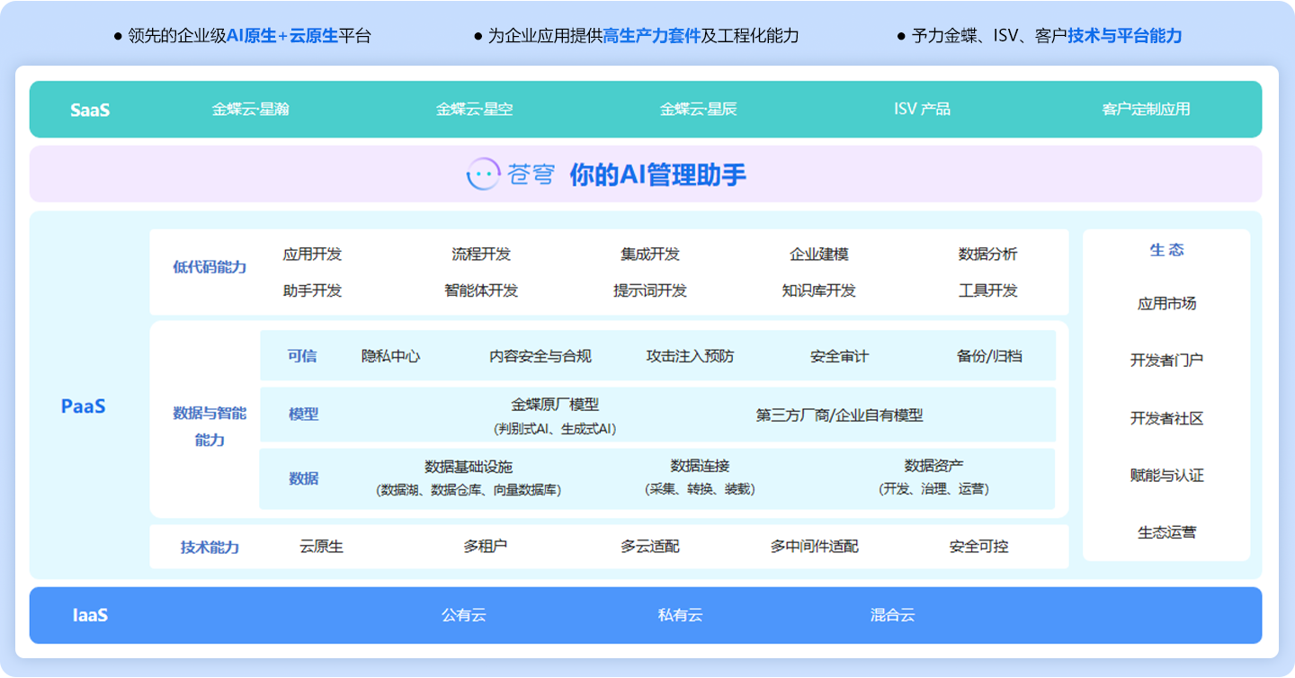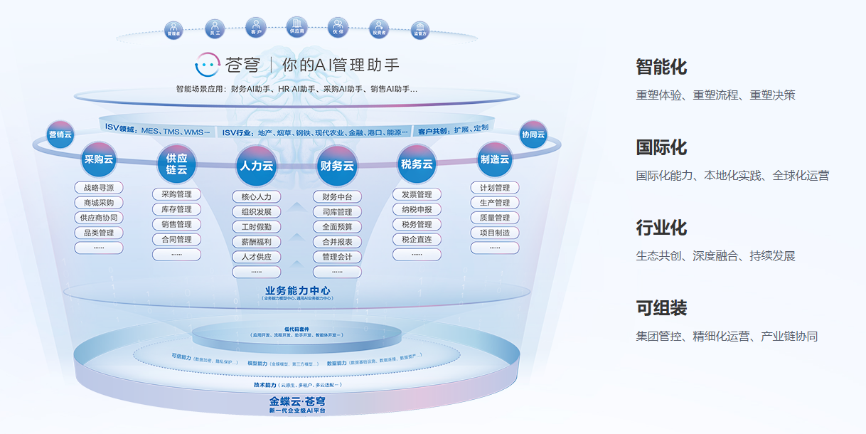 产品方面,公司依托“金蝶云·苍穹”可组装企业级PaaS平台,面向大型、高成长及小微企业分别推出星瀚、星空、星辰三大SaaS矩阵,覆盖财务、人力、供应链、制造、税务、PLM、MES、全渠道等50余种业务场景,并针对汽车、医药、餐饮、零售、先进制造等18大行业提供预置知识包与合规模板,实现“开箱即用、按需组装”,平均缩短交付周期四成;同时全线融入AI、大数据和物联网能力,帮助客户实时洞察经营、敏捷响应市场。