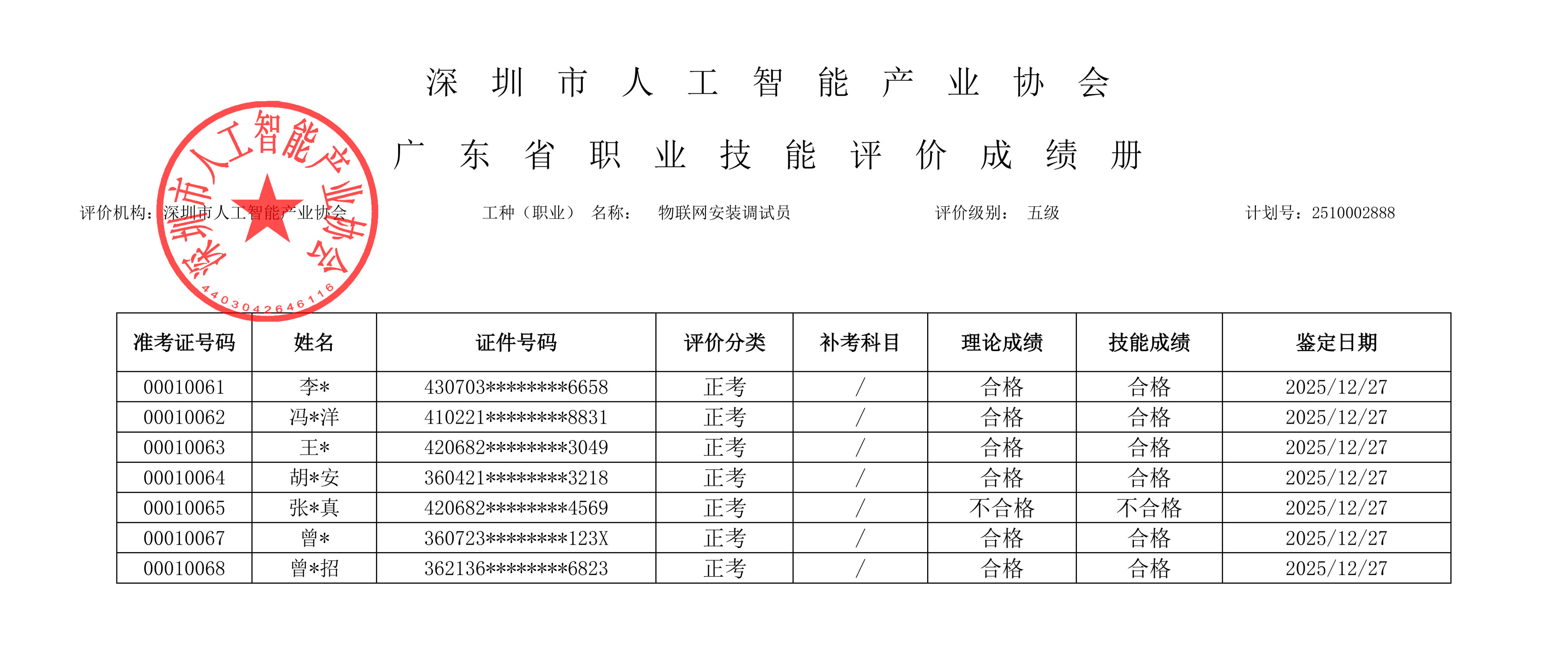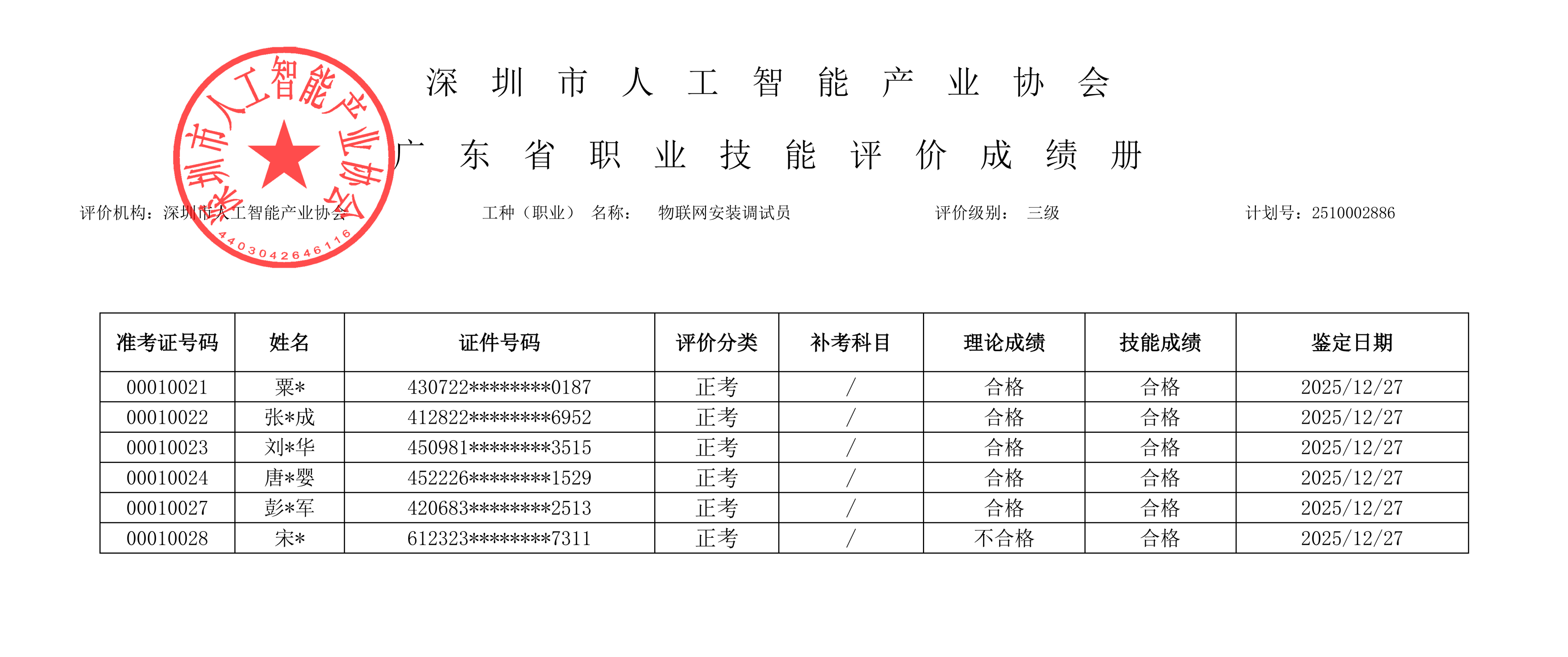 2025年第二批物联网安装调试员(三级、五级)职业技能等级认定考试(评价计划编号:2510002886、2510002888)顺利完成,考试结果现予公示。公示时间为:2025年12月31日-2026年1月7日止(共五个工作日)。若对下列考生考试结果有异议,请电话或书面向协会部门反映,反映至情况的电话和书面材料要自报或签署真实姓名,不报或不签署真实姓名的,一律不予受理。