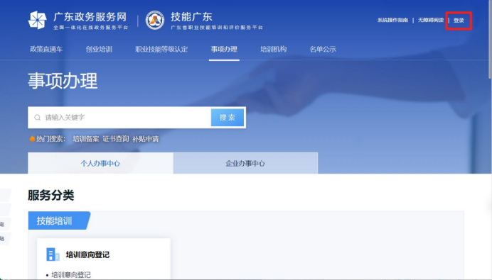 1、登录网址:https://ggfw.hrss.gd.gov.cn/0UPX/#/matterHandling,点击右上角【登录】
