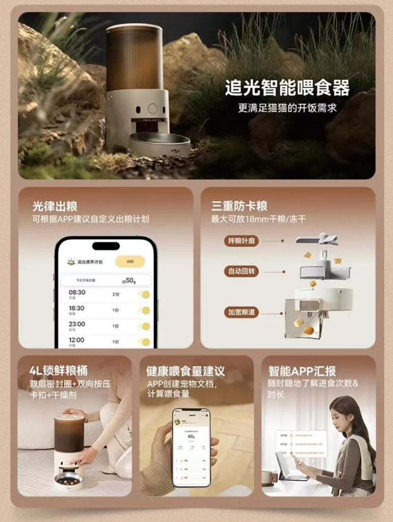 有迹追光·智能喂食器,以「光律喂养」贴合猫咪昼伏夜出的自然天性,用科技解锁省心养宠新方式!4L半透储鲜大桶搭配360°密封圈+干燥剂,防潮锁鲜无需额外储粮桶,18mm大颗粒猫粮与冻干也能通过三重防卡结构丝滑出粮,杜绝卡粮烦恼。