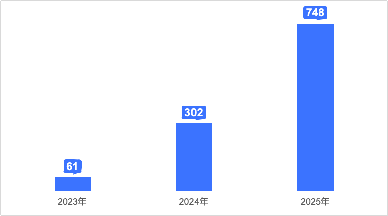 据中国网信办最新消息,截至2025年12月31日,我国累计有748款生成式人工智能服务完成备案,其中2025年全年新增446款生成式人工智能服务在国家网信办完成备案。据深圳市人工智能产业协会研究部统计,2023-2025年我国每年新增大模型备案数量分别为61款,241款,446款,备案数量呈逐年快速上升的趋势。图表:2023-2025年我国每年新增大模型备案数量(单位:款)据深圳市人工智能产业协会研究部统计,2023-2025年我国累计大模型备案数量分别为61款,302款,748款,累计备案数量每年翻番以上。图表:2023-2025年我国累计大模型备案数量(单位:款)大模型备案是企业面向公众提供生成式 AI 服务的合法前提,核心价值体现在合规、资源、市场、安全、商业化个方面,是企业在 AI 领域稳健发展的重要保障。备案不仅能让企业规避未合规运营带来的下架、罚款等风险,还可凭借备案资质获得各地资金补贴、税收减免、算力优惠等政策红利,同时成为政府项目、国企采购的重要准入条件。备案带来的官方背书,能显著增强用户、合作方与投资方的信任,在招投标、商业合作中形成竞争优势,也能顺利融入主流 AI 生态渠道。此外,备案的审核要求会推动企业强化模型内容过滤、数据隐私保护能力,完善风险防控体系,倒逼技术优化升级,让研发更聚焦创新与产品打磨,最终加速大模型的商业化落地与业务增值,为企业在 AI 赛道的长期发展筑牢基础。