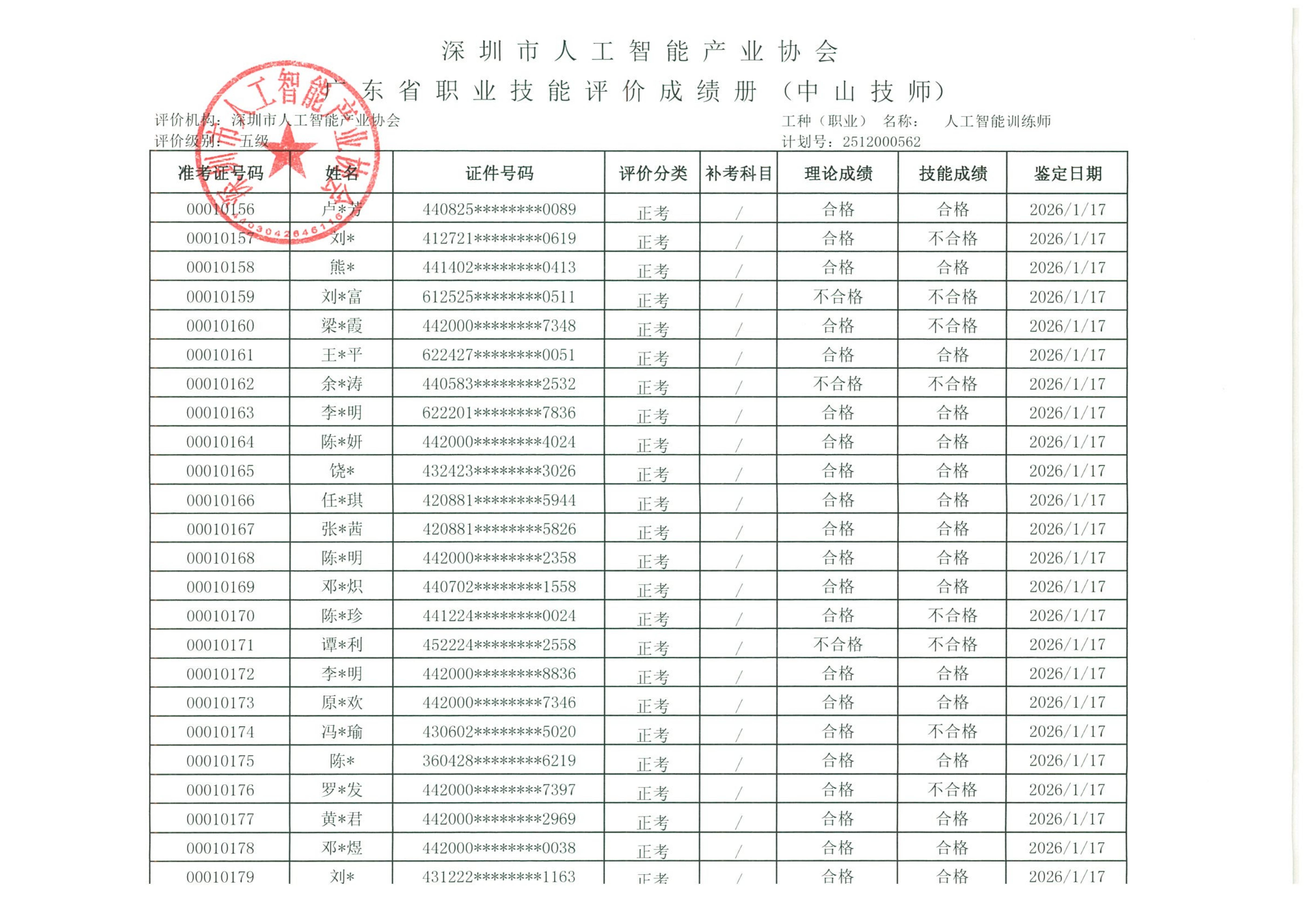 2026年中山市首批人工智能训练师职业技能等级认定考试(评价计划编号:2512000562)顺利完成,考试结果现予公示。公示时间为:2026年1月21日-2025年1月27日止(五个工作日)。若对下列同志考试结果有异议,请电话或书面向协会部门反映,反映至情况的电话和书面材料要自报或签署真实姓名,不报或不签署真实姓名的,一律不予受理。