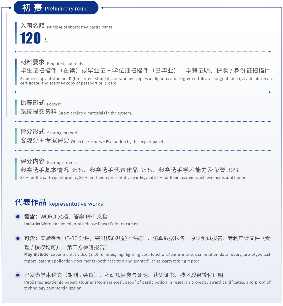 学历要求:参赛选手为在读硕士研究生、博士研究生或硕士毕业生、博士毕业生(需提供毕业证明材料)。