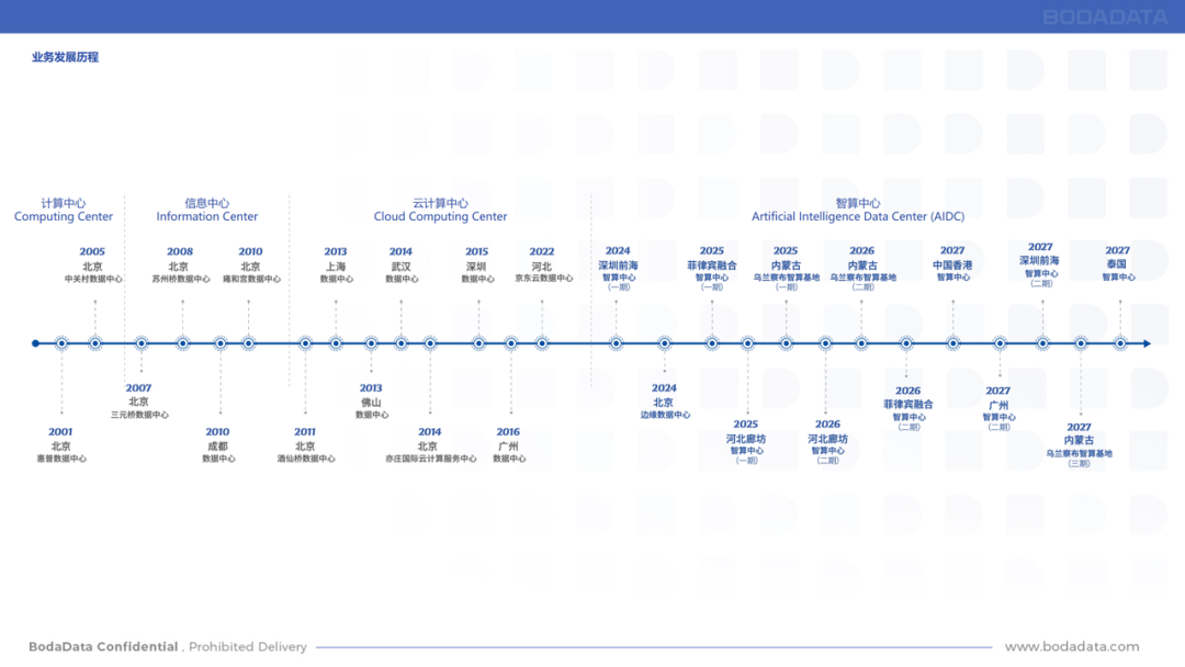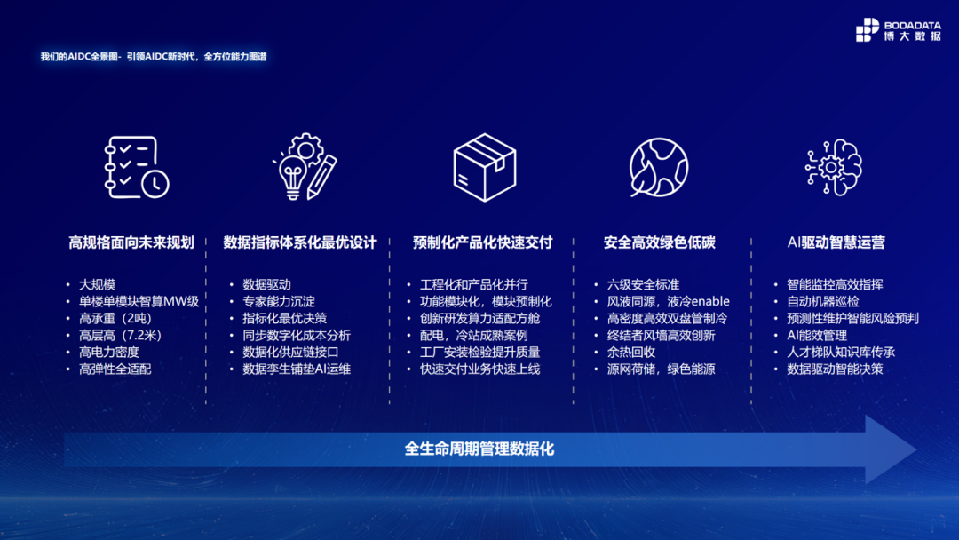 "智算中心正在经历深刻变革,面临高配电、强制冷等挑战。博大数据通过高规格规划设计,实现单楼单模块智算MW级、高承重(2吨)、高层高(7.2米)的突破性架构。我们的AIDC全景图涵盖六大能力维度,为AI发展提供坚实底座。"