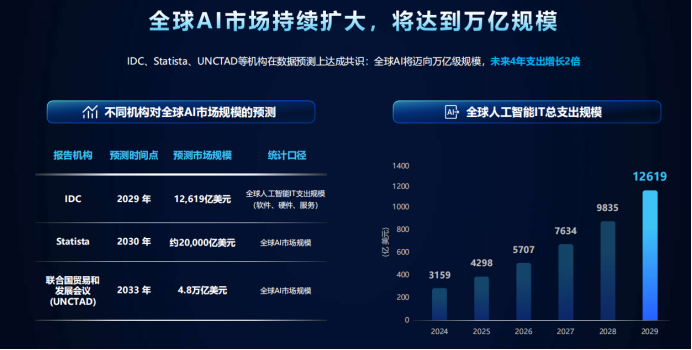 "全球AI市场正迈向万亿级规模,IDC预测2029年人工智能IT支出规模将达到12,619亿美元。各国聚焦不同优势领域:中国依托丰富应用场景推进'人工智能+'行动,美国专注基础模型创新,欧洲重在AI工厂建设。"