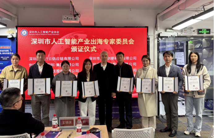 随后,深圳市人工智能产业出海专家委员会颁证仪式顺利开展,深圳市人工智能产业协会高级顾问葛明先生出海委员会委员颁发证书,正式组建专业出海智囊团,汇聚各领域顶尖智慧,为企业出海提供技术合规、本地化运营、市场研判等全方位智力支持,填补了AI出海专业智囊服务的关键缺口,与战略签约形成合力,夯实了AI出海的生态根基。