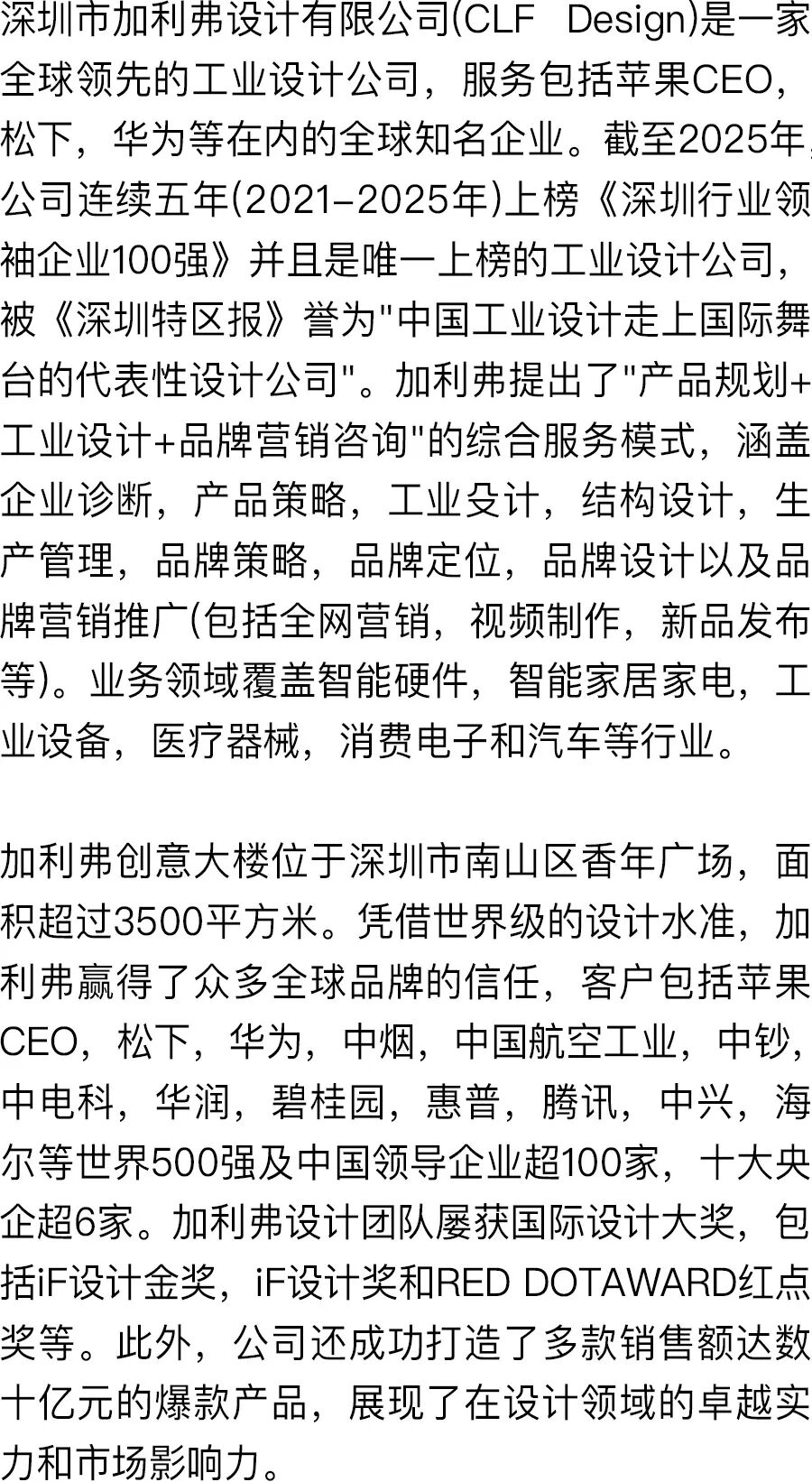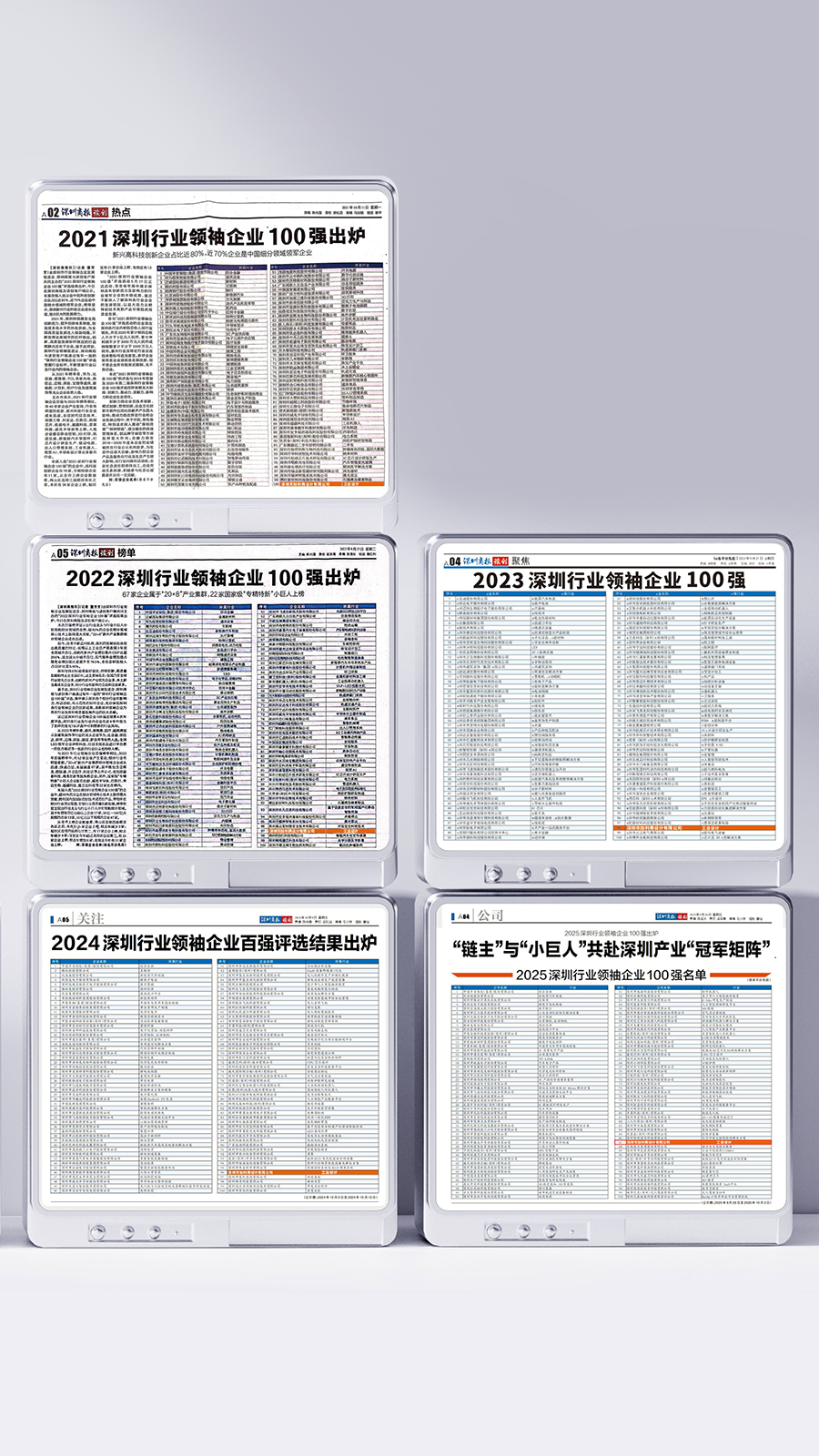 2021、2022、2023、2024、2025 年《深圳行业领袖企业100强》上榜的设计公司,成为深圳近32000家设计公司中唯一入选的设计公司。