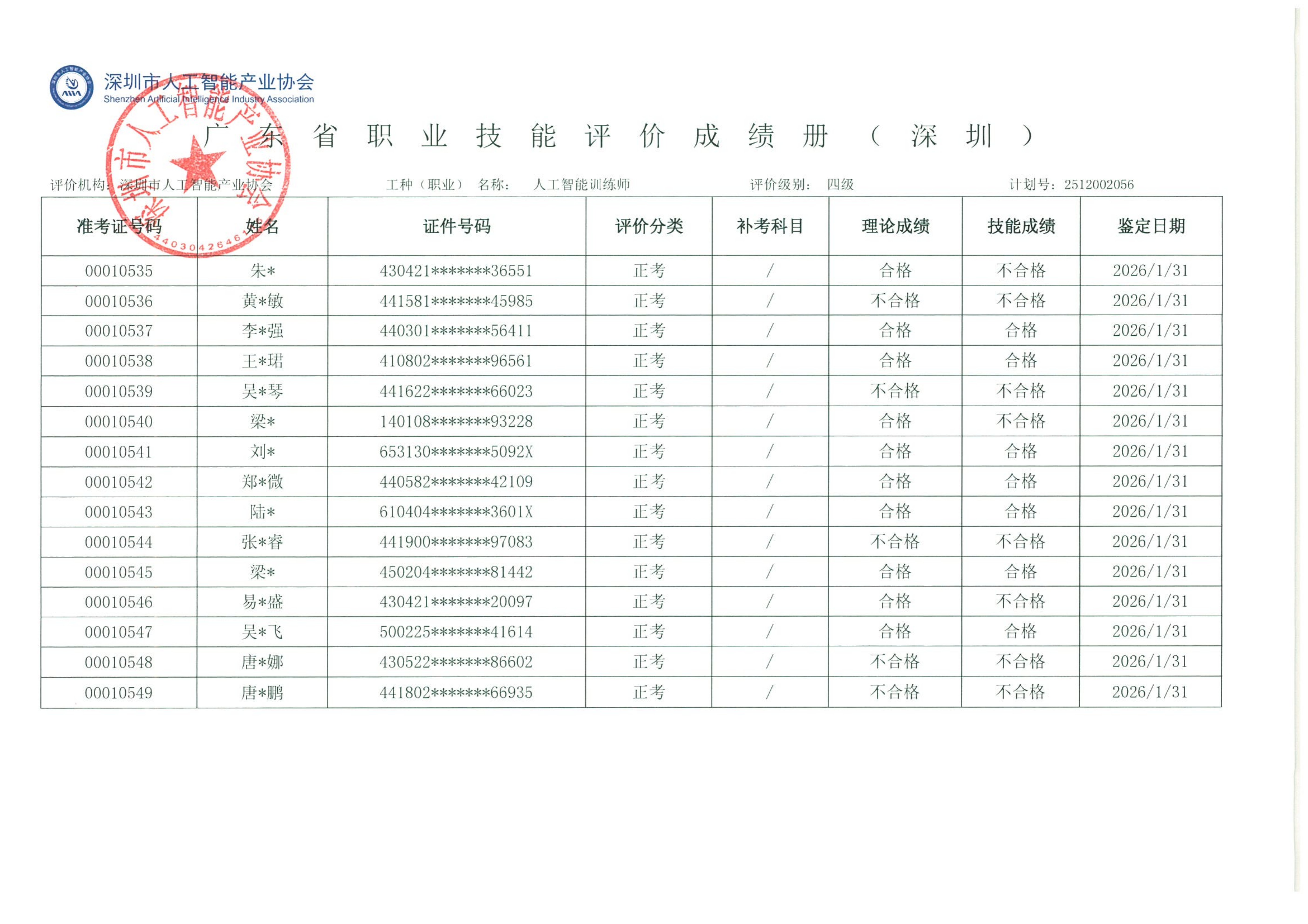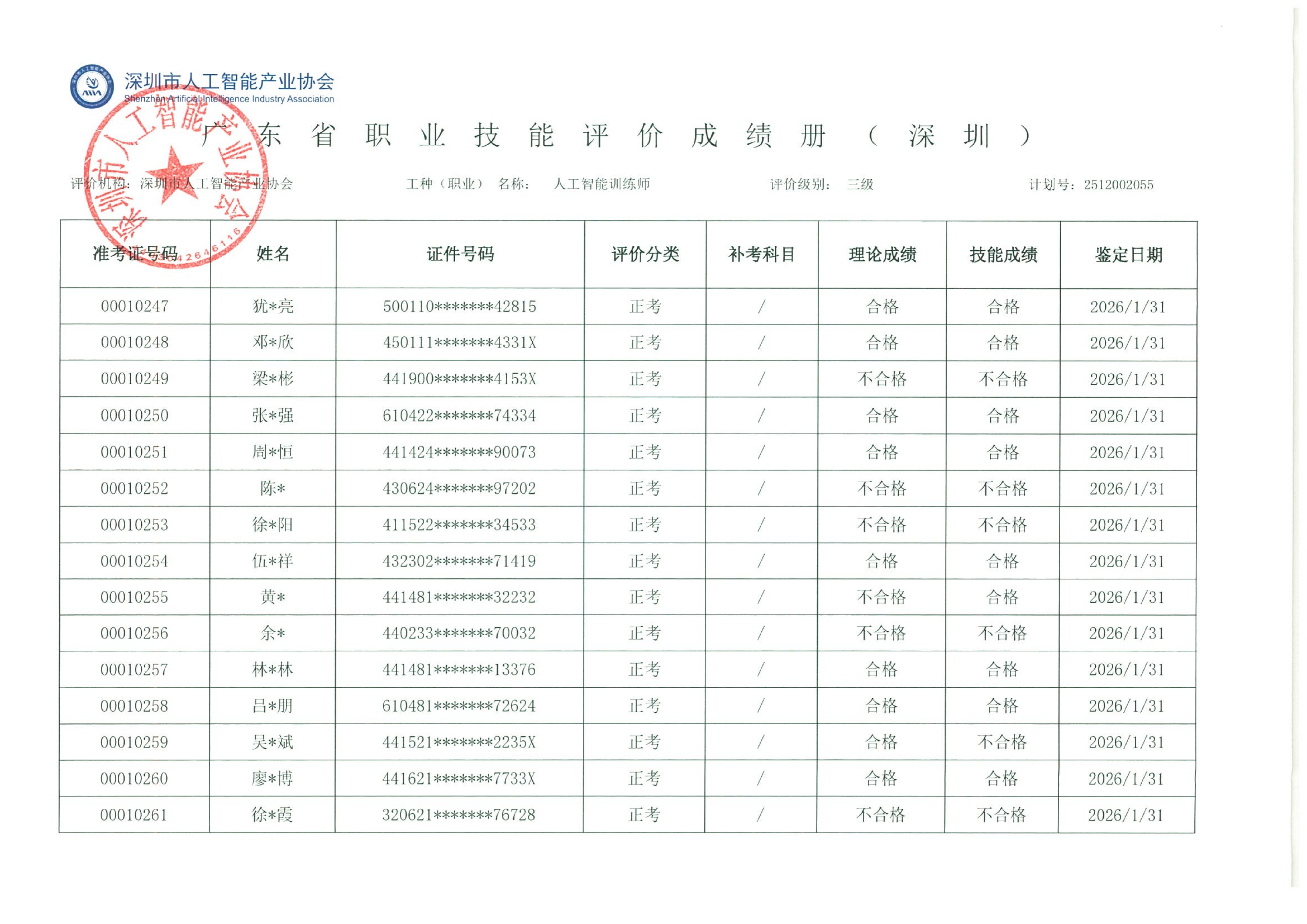 2026年深圳市第一批人工智能训练师职业技能等级认定考试(评价计划编号:2512002055、2512002056、2512002057)顺利完成,考试结果现予公示。公示时间为:2026年2月5日-2026年2月11日止(五个工作日)。若对下列同志考试结果有异议,请电话或书面向协会部门反映,反映至情况的电话和书面材料要自报或签署真实姓名,不报或不签署真实姓名的,一律不予受理。