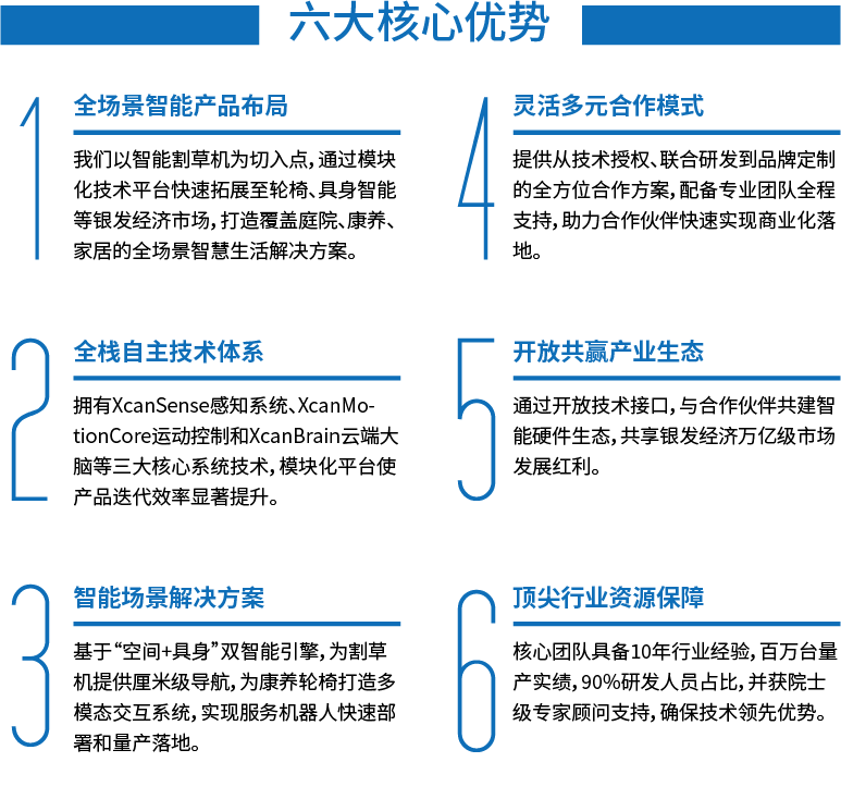 模型落地方面,XcanBrain通过自动驾驶领域的OCC技术(占据网络技术,一种基于深度学习的三维环境感知技术),将场景空间占据信息进行高效编码,并通过网络轻量化设计降低算力需求,使其具备了海量国产芯片的适配性,从而在割草机、轮椅等消费级产品上落地。此外,我们通过与北京航空航天大学、西安电子科技大学等高校开展的产、学、研合作,持续打造真正理解家庭需求、能够成为“智慧伙伴”的机器人操作系统。