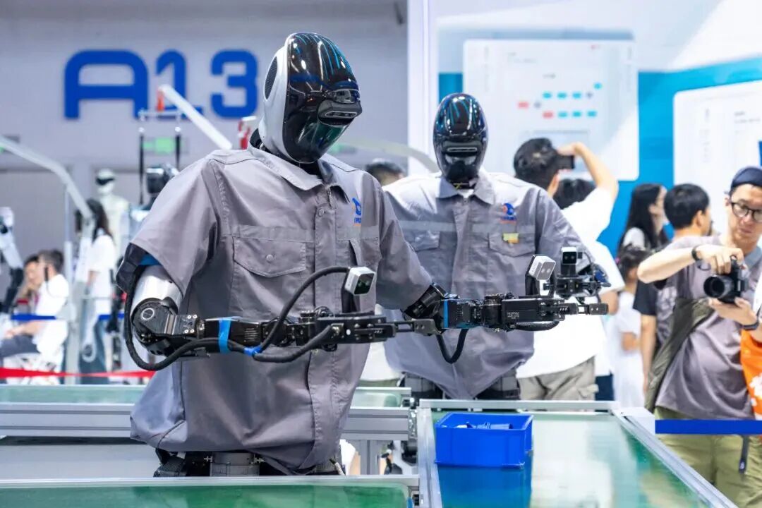 2025年8月12日,在2025世界机器人大会现场,各种人形机器人集中亮相,生产线上的机器人引人瞩目。图/视觉中国
