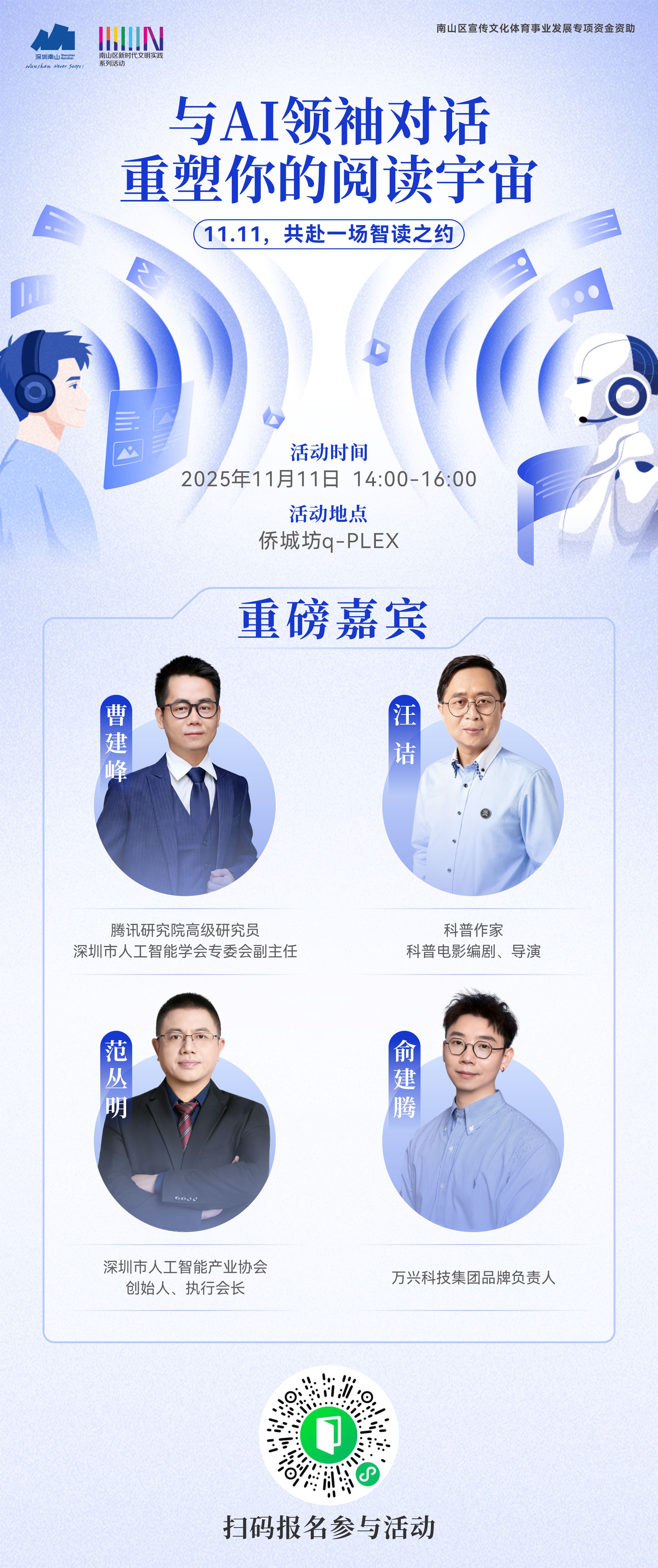 11月11日,快来南山区侨城坊Q-PLEX SPACE·综合文化空间,这里将开启“智读未来——2025AI+阅读播客大会”,沉浸式未来阅读体验,带您解锁科技赋能的新体验。 2025AI+阅读播客大会作为深圳读书月重要联动环节,由南山区委宣传部支持,深圳报业集团深圳晚报社、深圳喜马拉雅联合承办,深圳市人工智能产业协会协办,将打破传统知识传播边界,每一个环节都在探索AI与阅读的创新结合点。 亮点一 《中国·深圳AI产业地图》视频将在现场首次亮相 该视频由主办方联合深圳市人工智能产业协会共同制作,数据源自汇聚502位产业专家、298位学术专家及1160家会员企业的权威资源库。 亮点二 打卡未来阅读直播间提前感受未来阅读的模样吗?大会设置的“未来阅读直播间”绝对不容错过! 这一展区以轻量化直播展陈装置为核心,融入AI拍照机、AI Holobox等前沿产品,搭配科技感十足的展板设计与互动装置,打造出沉浸式“虚拟阅读空间”。 AI拍照机内置丰富多彩的拍照风格素材库,从逗趣丑萌的黏土画风到极具未来感的赛博朋克风格一应俱全,用户可根据自己的需求选择合适的风格进行创作,平台还能提供定制化模板服务,满足用户的个性化需求。同时,拍照机自带美颜效果,张张都是高光时刻。 无论是打卡合影还是近距离体验AI赋能的阅读新场景都能让你直观触摸“未来阅读”的创新形态,感受科技为知识传播带来的变革 亮点三 大咖圆桌沙龙,探讨“AI如何重塑阅读方式” 大会将举办高质量圆桌沙龙,邀请腾讯研究院高级研究员曹建峰、科普作家汪诘、深圳市人工智能产业协会创始人范丛明、万兴科技集团品牌负责人俞建腾等行业大咖,从数字阅读、播客听读、知识推荐、内容共创等维度,探讨AI能否成为“新时代阅读助理”,以及如何借助AI延展知识边界。 目前大会观众招募已正式启动!扫描海报上的报名二维码即可获取报名信息锁定参与席位,11月11日让我们相约侨城坊共同探索AI赋能下的阅读未来,见证科技与人文碰撞的精彩火花! 活动时间 2025年11月11日14:00-16:00 活动地点 深圳市南山区侨香路4080号侨城坊q-plex 第26届深圳读书月南山区分会场精彩活动