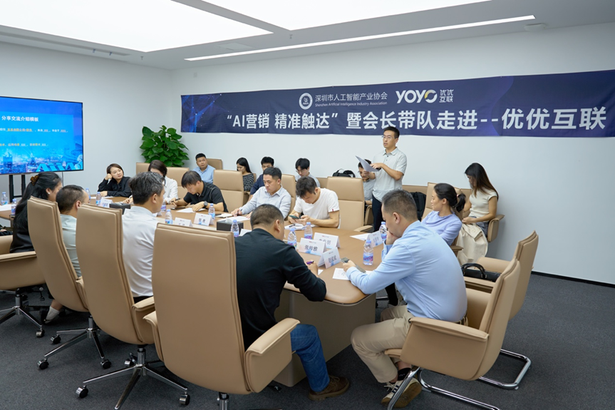 为帮助企业把握AI营销趋势、破解投放痛点,同时搭建行业交流合作桥梁,深圳市人工智能产业协会于2025年11月6日举办“AI营销、精准触达暨秘书长带队走进优优互联”活动。深圳市人工智能产业协会常务秘书长王健亲自率队,携二十余位AI领域知名企业家、行业精英走进优优互联,围绕人工智能技术在营销场景的创新应用、产业落地及未来发展趋势展开深度研讨。优优互联副总裁邹焘、创新业务负责人谢鑫及核心管理团队共同参与,与参会嘉宾共话行业变革。