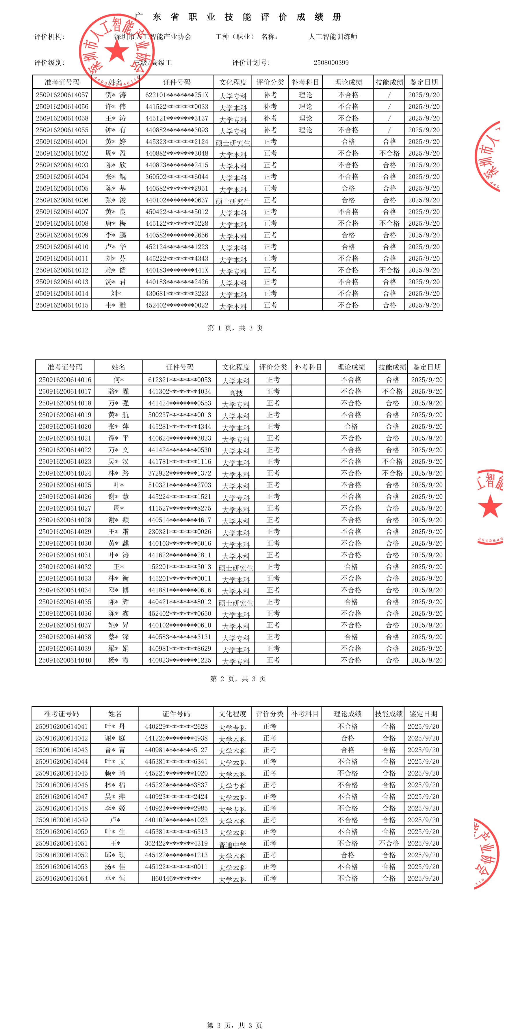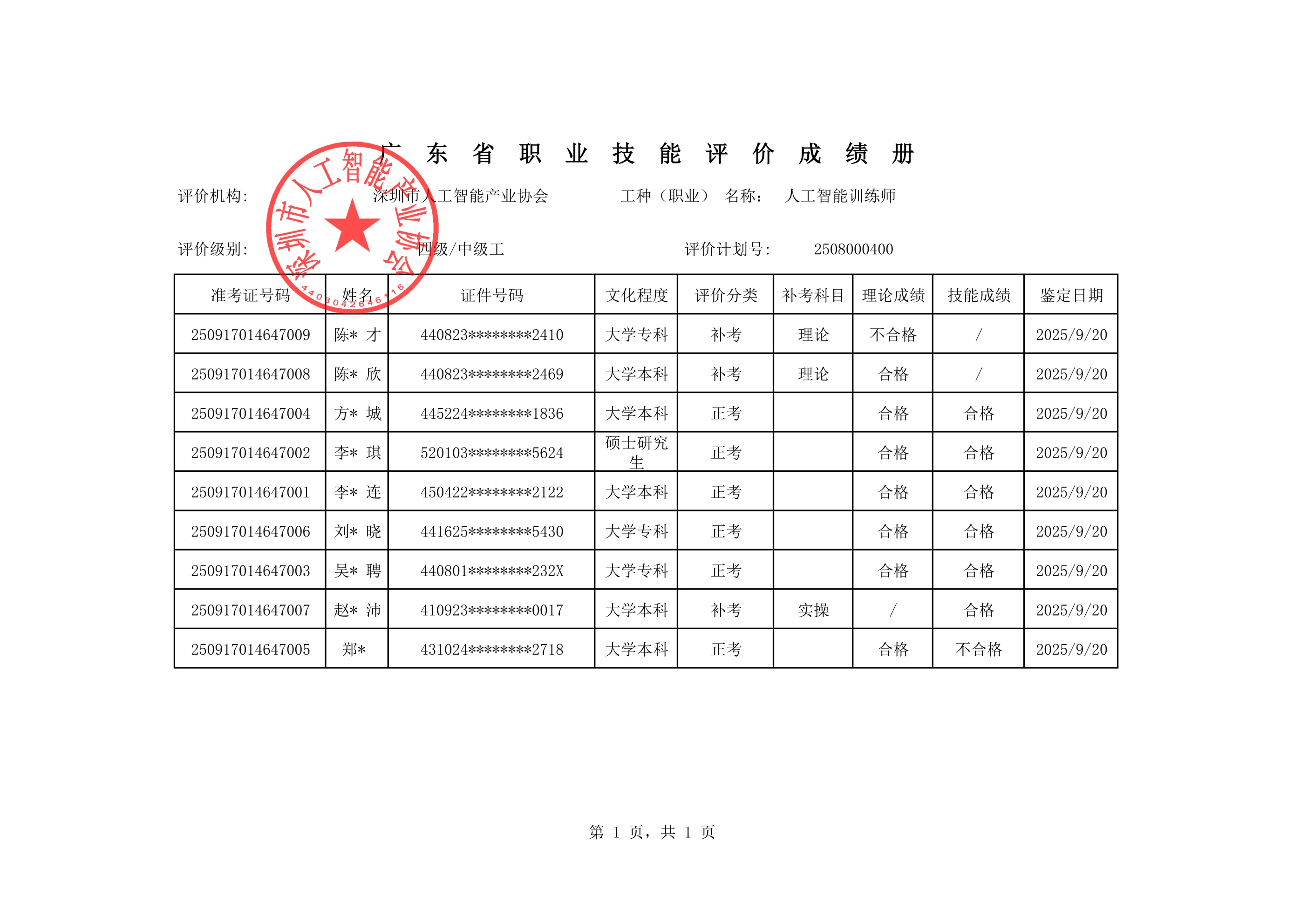 2025年广州市第二批人工智能训练师职业技能等级认定考试(评价计划编号:2508000399、2508000400)顺利完成,考试结果现予公示。公示时间为:2025年9月24日-2025年9月30日止(共五日)。若对下列同志考试结果有异议,请电话或书面向协会部门反映,反映至情况的电话和书面材料要自报或签署真实姓名,不报或不签署真实姓名的,一律不予受理。