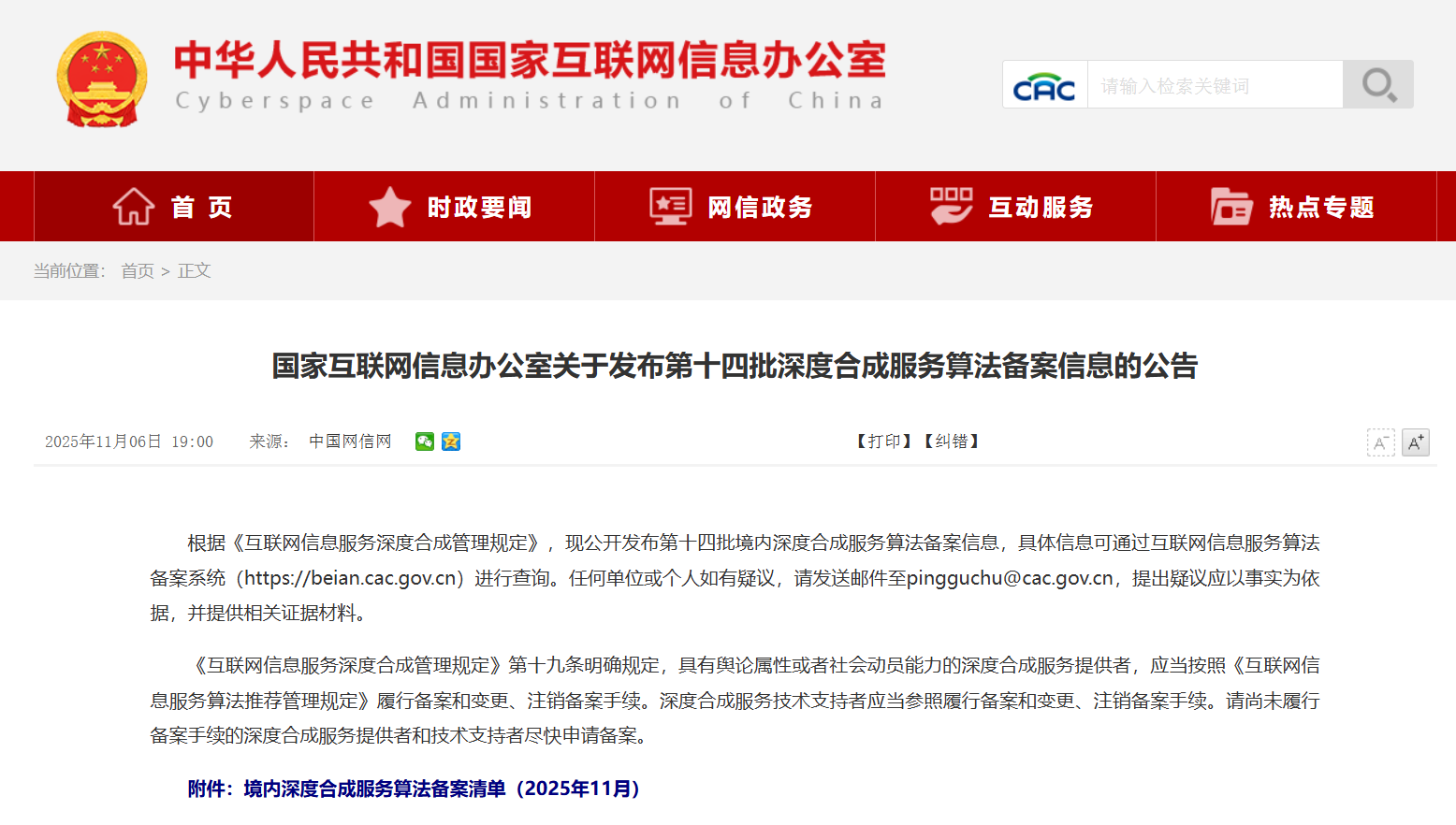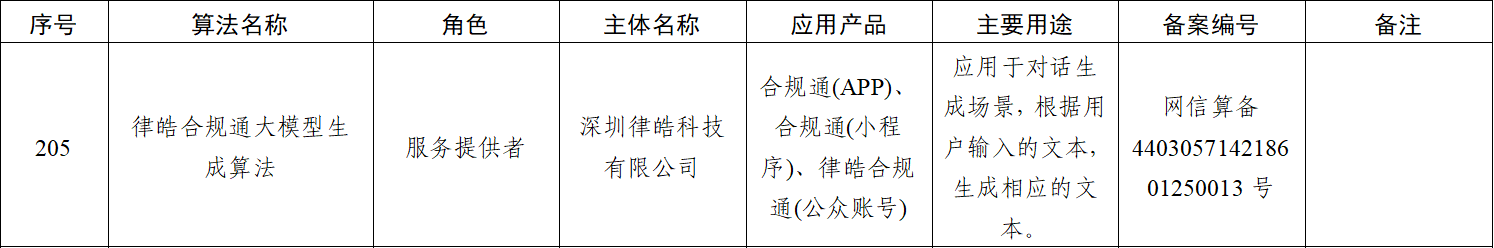 11月6日,国家网信办公布了第十四批深度合成服务算法备案信息的公告,由律皓科技研发的“合规通大模型”通过了国家网信办的深度合成算法服务备案。