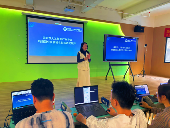 开班首日,特邀深圳市人工智能产业协会轮值副会长兼秘书长杨诗虹莅临现场并致辞。她围绕协会的组织架构、发展现状与未来趋势作了简要介绍,强调协会始终以教育培训为桥梁,致力于推动人工智能与传统产业深度融合,培养更多高素质 AI 专业人才。
