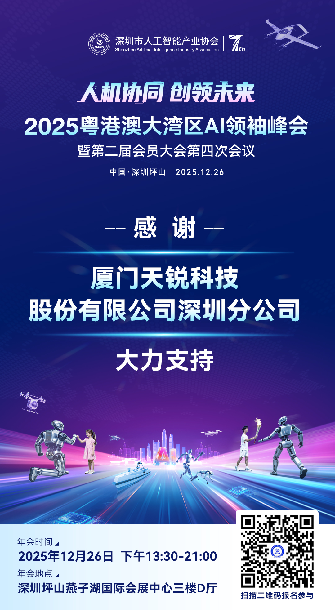 2025粤港澳大湾区AI领袖峰会暨第二届会员大会第四次会议汇聚1300+大湾区品牌名企、AI领域权威院士及专家,搭建起行业交流、资源对接、思想碰撞的顶级平台。此次厦门天锐科技股份有限公司深圳分公司的加入,将为大会注入更多数据安全与AI融合的实践经验,助力参会者探索智能时代安全发展新路径。12月26日,让我们与厦门天锐科技股份有限公司深圳分公司及全体参会伙伴一道,聚焦人机协同新赛道,共绘智能产业安全新蓝图!