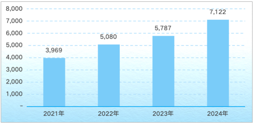 过去4年,人工智能核心产业规模从2021年的3969亿元逐步增长至2024年的7122亿元,各年度规模分别为3969亿元、5080亿元、5787亿元、7122亿元。对比2021年,2024年人工智能核心产业规模增长了0.79倍。
