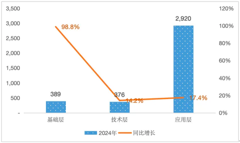 AI技术层产值376亿元,同比增长14.2%,占总规模10.2%,首次低于基础层产值。