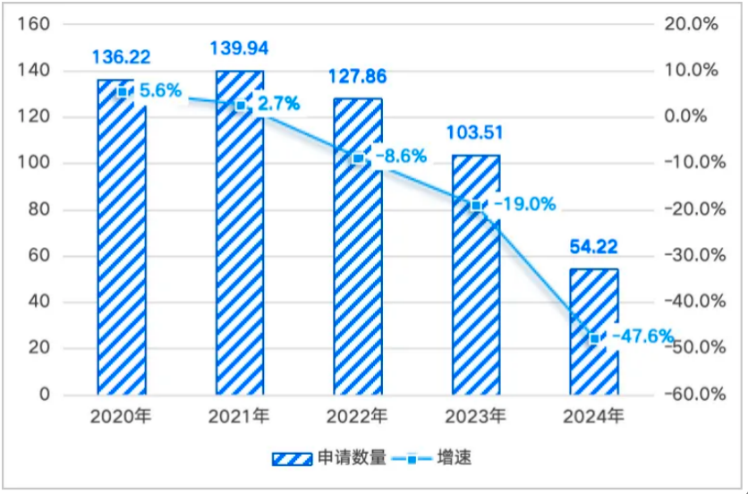 图表:2020年-2024年全球AI相关专利申请数量(万件)