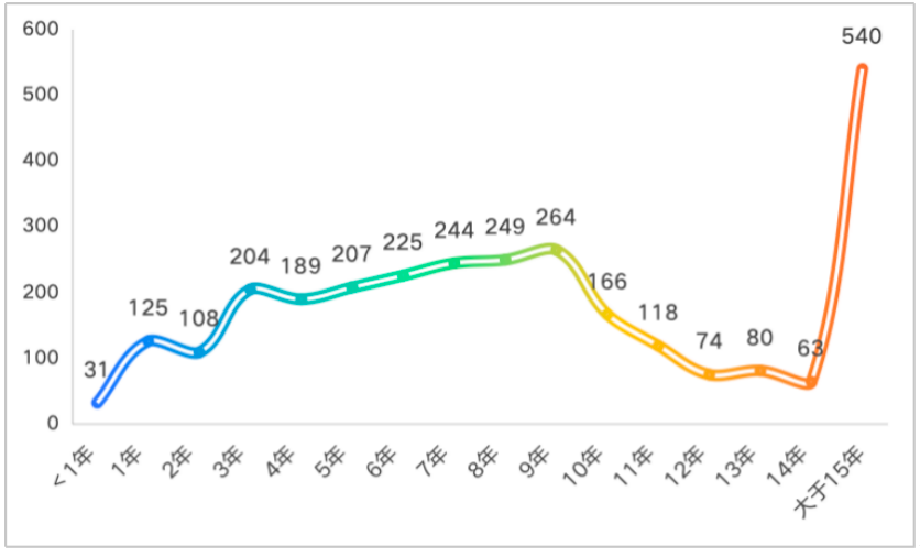 据深圳市人工智能产业协会研究部统计,截至2024年12月,深圳共有2887家人工智能典型企业,其平均成立时间为10年。其中,成立时间少于10年的企业有1846家,占比63.9%;成立时间超过10年的企业有1041家,占比36.1%。从第9年开始至今,被纳入典型AI企业的数量整体呈下降趋势。