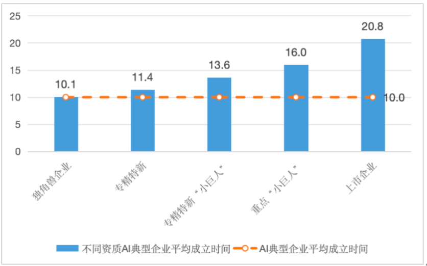 进一步细分来看,独角兽AI典型企业平均成立时间10.1年,专精特新AI典型企业平均成立时间11.4年,专精特新“小巨人”AI典型企业平均成立时间13.6年,重点“小巨人”AI典型企业平均成立时间16.0年,AI相关上市企业平均成立时间20.8年。这一数据序列呈现出随着企业资质等级提升,平均成立时间递增的趋势。